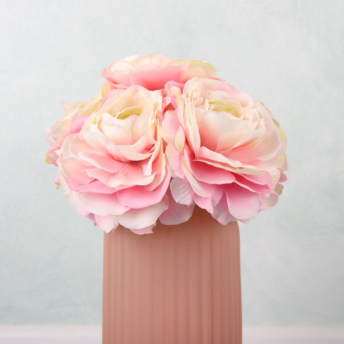 Rose et crème ! C'est le romantisme exprimé en couleurs. Ce petit bouquet de mariée très raffiné se compose de 7 magnifiques renoncules qui présentent un dégradé de couleurs allant du rose au blanc crème. Grâce à la technique de liage compacte, les renoncules ont une disposition ordonnée et symétrique qui garde leur forme même lors de la fête de mariage la plus sauvage. Shop the Look!