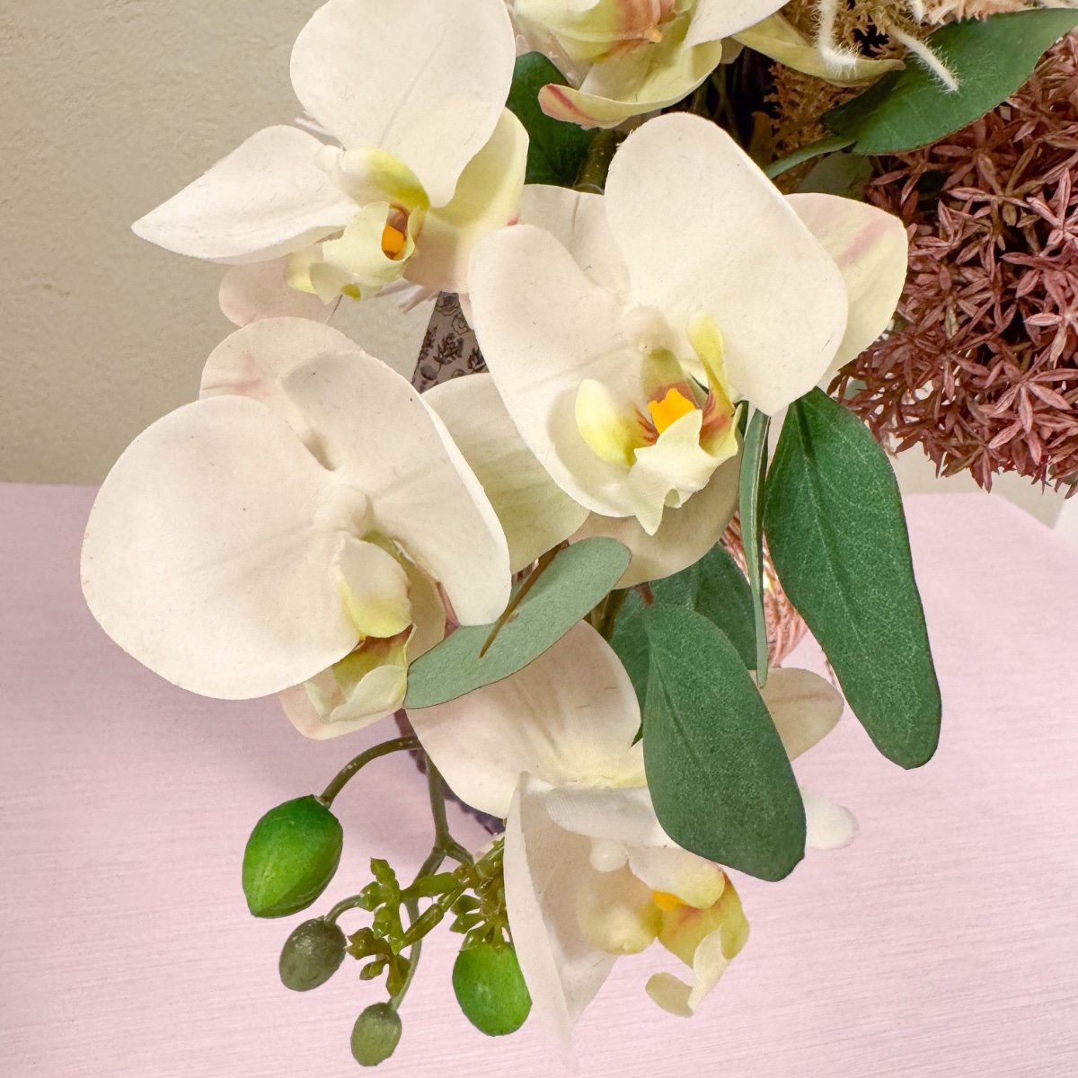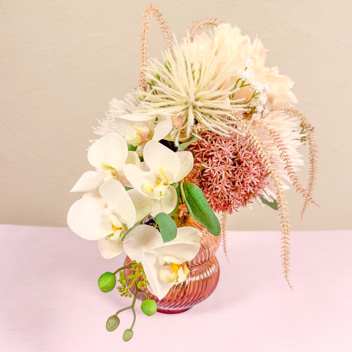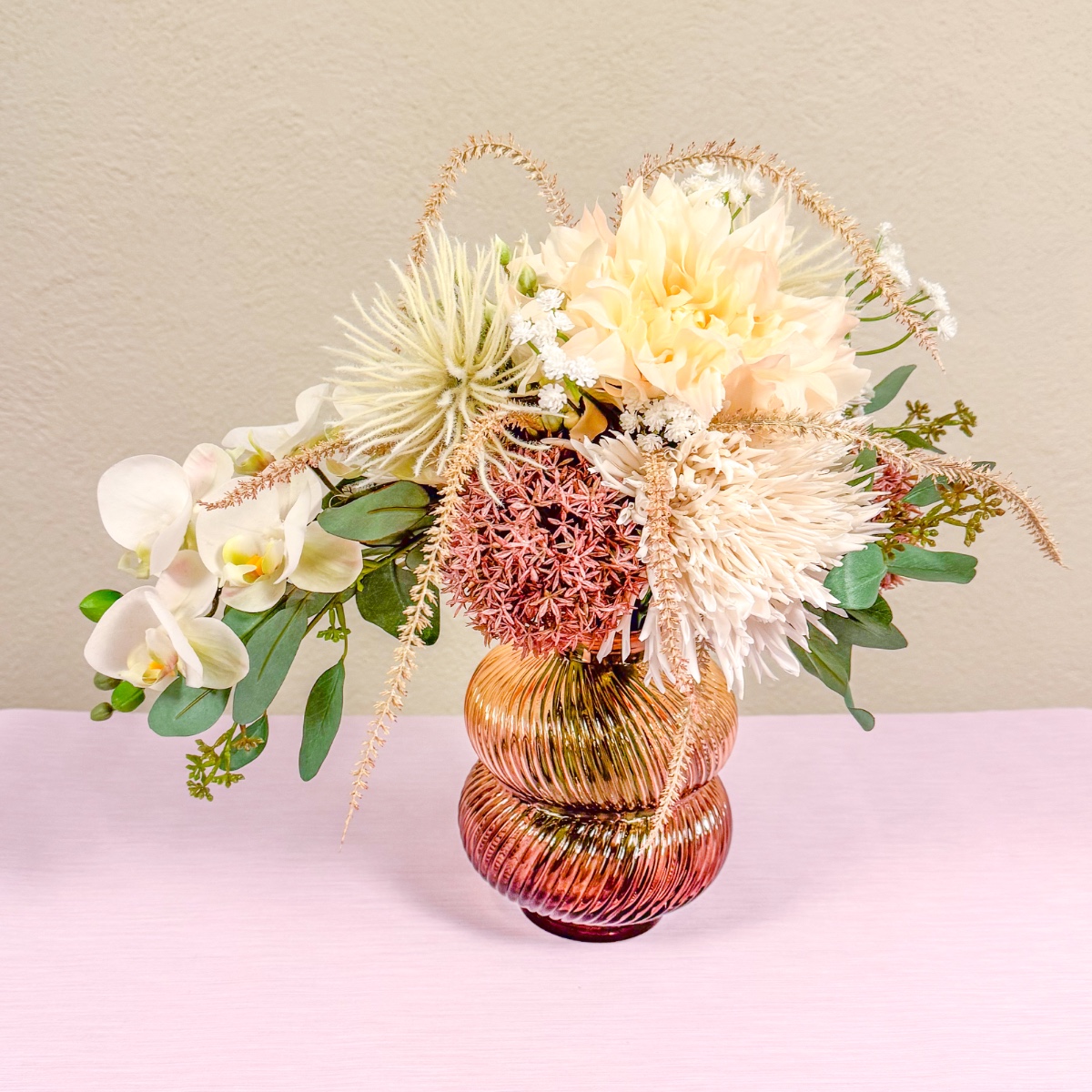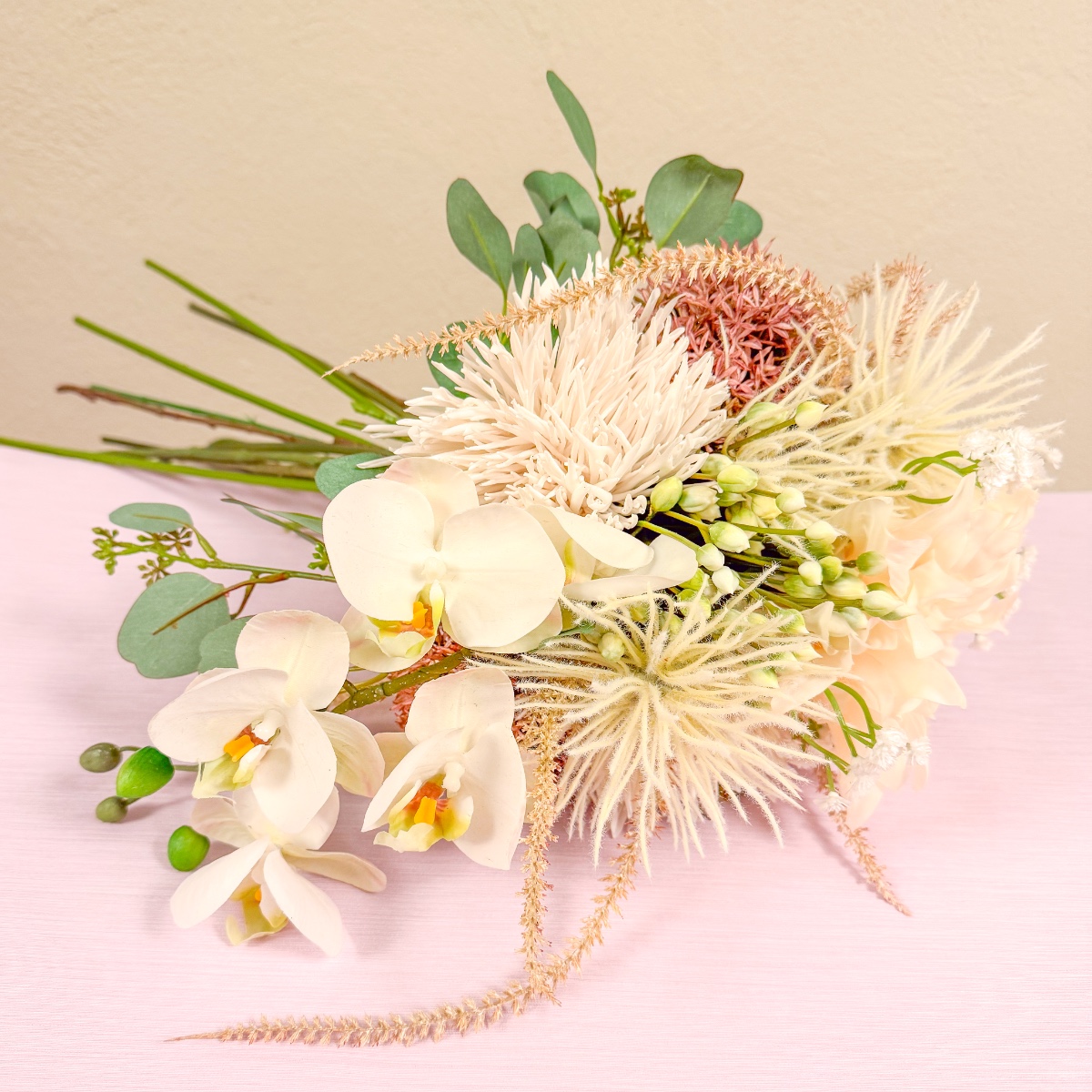 Chrysanthème sauvage et orchidée élégante ! Il ne manquait plus que le bouquet de mariée assorti à sa robe de mariée dans un ton blush délicat. Il fallait absolument des orchidées, associées à des fleurs dont les couleurs s'harmonisent parfaitement avec la robe. Le résultat : un bouquet élégant qui reprend les tons doux de la tenue et complète avec style le look de Celina. Shop the Look !