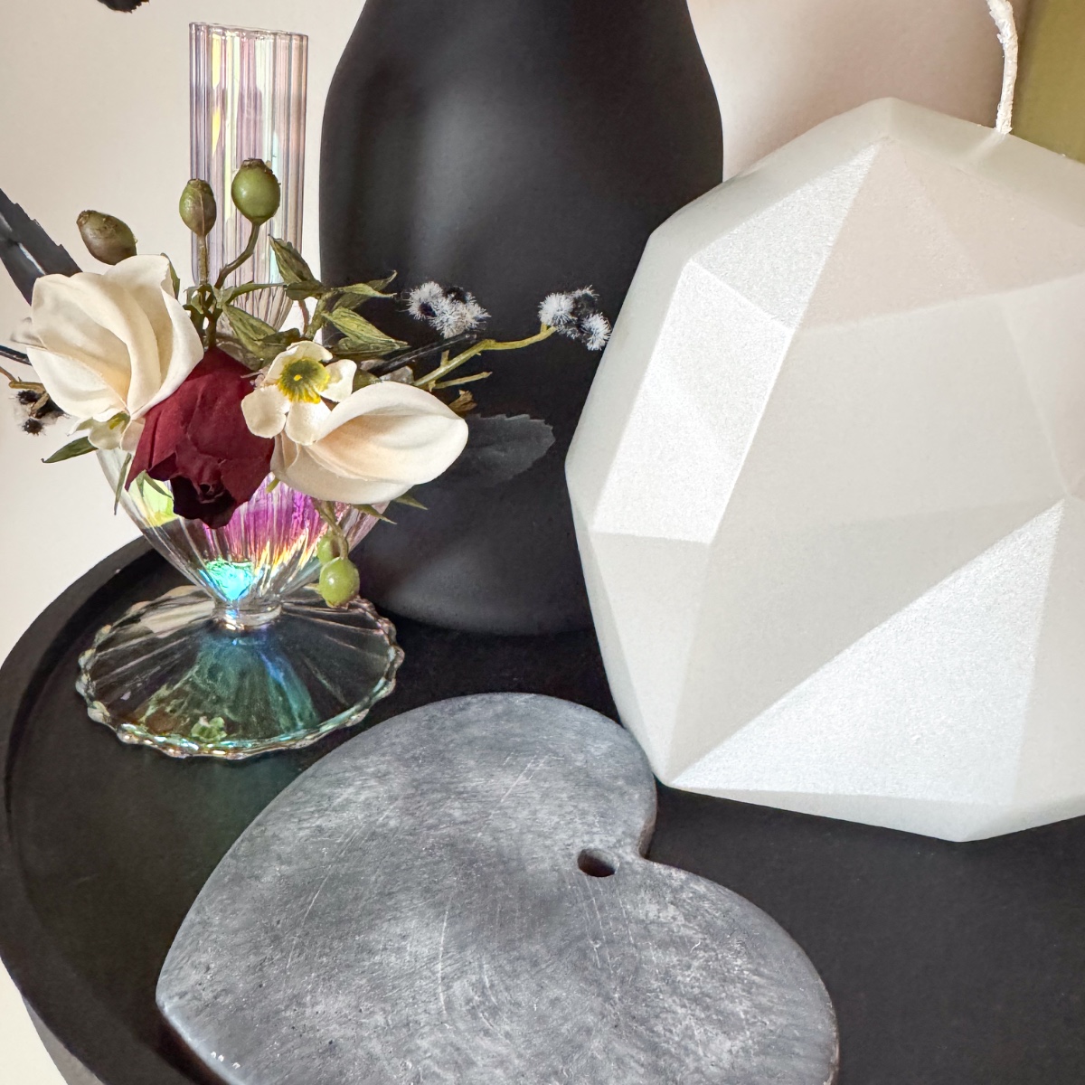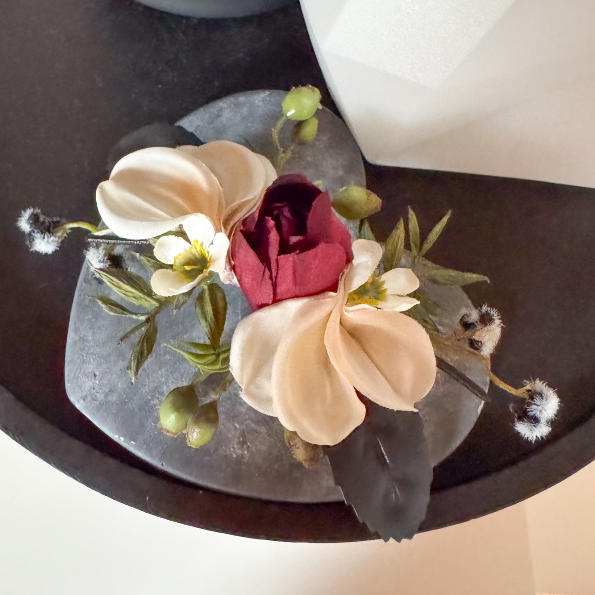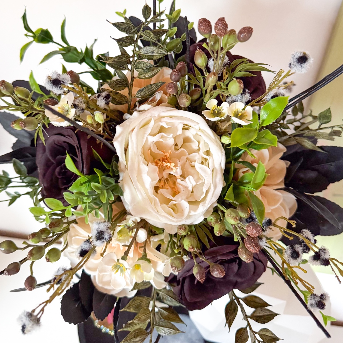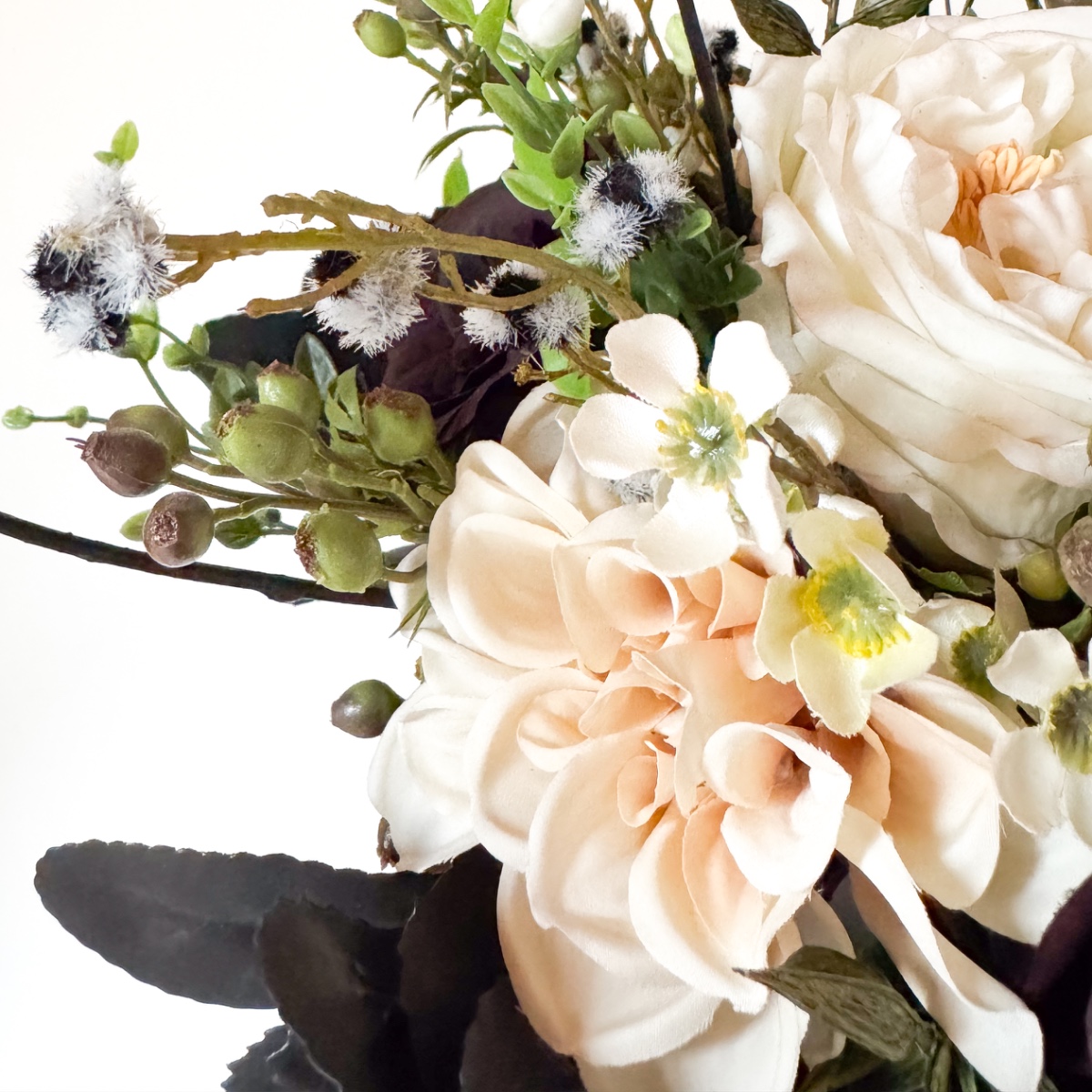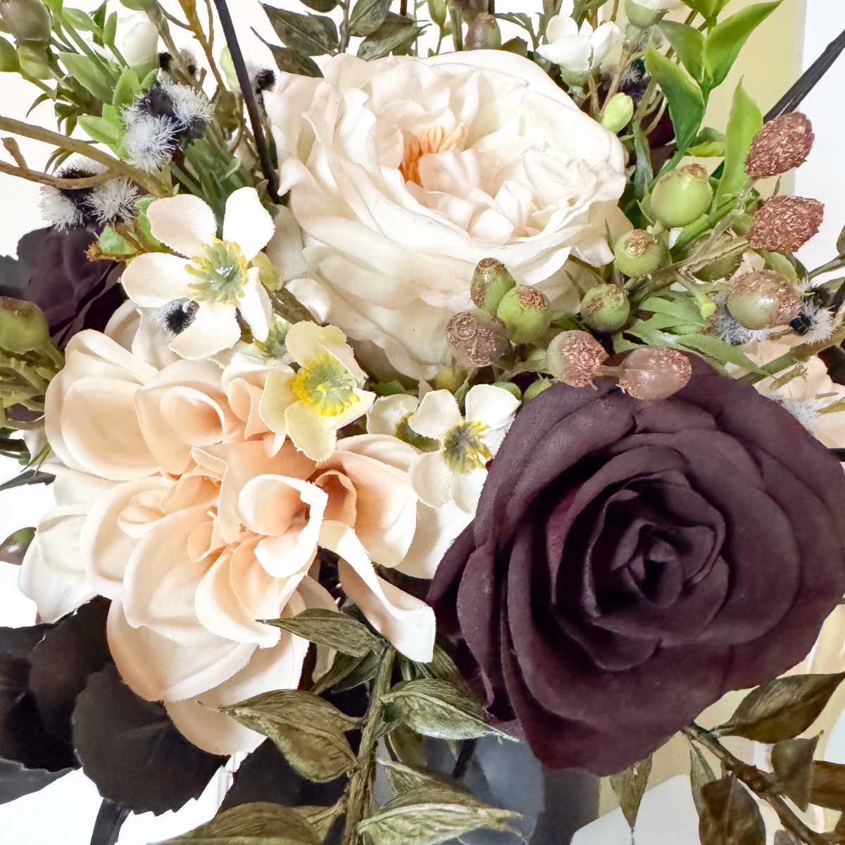 De l'amour dans chaque pétale ! Le jour du mariage de Nicole, le 31 octobre 2025, tout doit être en parfaite harmonie, de la robe de mariée rayonnante à chaque détail floral. Le bouquet de la mariée reflète cette harmonie enchanteresse : de délicates roses crème et des dahlias poudrés se marient à des roses noires et rouge foncé mystérieuses pour former un bouquet plein d'élégance et de profondeur. De fines fleurs de cire crème et de petites baies de myrte ajoutent une touche ludique, tandis que la Stirlingia latifolia en noir et blanc confère au bouquet une note moderne et raffinée. Le fragon et le troène se nichent délicatement entre les fleurs comme des feuilles vertes, tandis que le maté et le cornouiller soulignent les nuances noires mystérieuses – un poème floral qui s'harmonise parfaitement avec la robe nude rehaussée de dentelle noire. Et pour couronner la coiffure de la mariée : une barrette assortie qui reprend les couleurs et l'élégance du bouquet, comme un reflet délicat de la splendeur des fleurs. Chaque fleur, chaque branche de baies et chaque touche noire raconte un petit bout de leur histoire d'amour et rend ce moment inoubliable. Shop the Look!