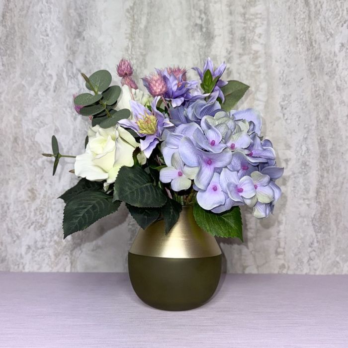 L'amour fleurit pour toujours ! En parcourant notre boutique en ligne, notre cliente habituelle Monika est tombée sur un ancien projet de bouquet de mariée. Elle s'est demandé s'il était possible de reproduire son propre bouquet de mariage et nous a écrit un message. Le bouquet devait être une surprise inoubliable pour sa femme, qui lui rappellerait le jour de leur mariage. Une belle déclaration d'amour, selon nous. Le bouquet est composé d'un hortensia luxuriant d'un lilas délicat et de roses de couleur crème. Ces fleurs ont été complétées par de fines clématites et un feuillage vert de branches de pommier et d'eucalyptus. Pour la première fois, nous avons également utilisé des fleurs séchées qui ont apporté des touches de couleur entre les pétales de roses. Notre cliente était très contente de notre bouquet de mariée. Vous aussi, vous aimeriez un bouquet de mariage artificiel pour l'éternité ? Shop the Look!