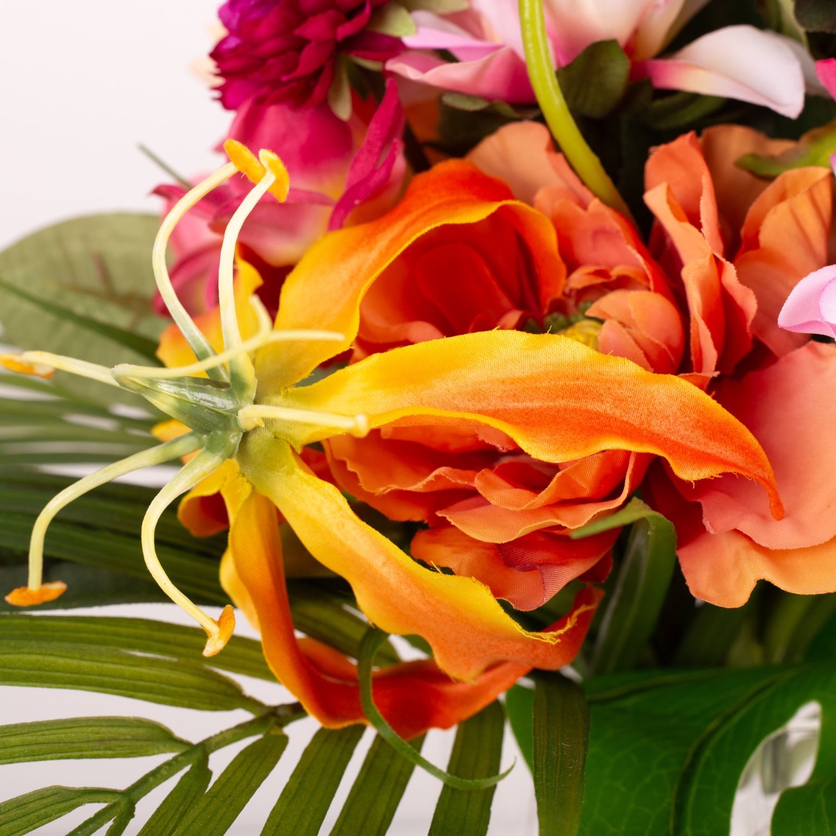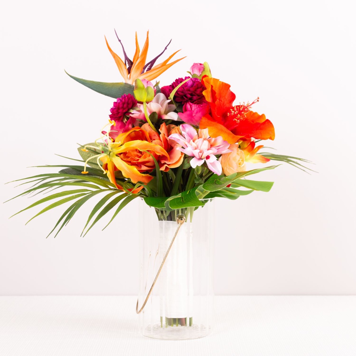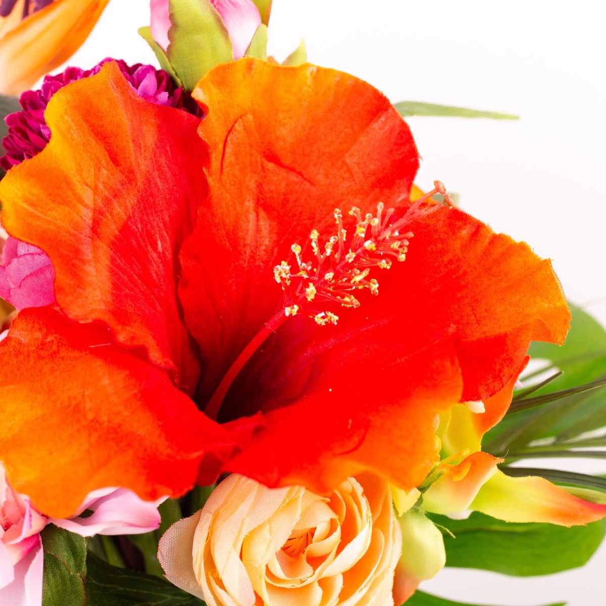 Des fleurs exotiques pour Hawaï ! Pour son mariage de rêve à Hawaï, qui aura lieu au printemps, suivi d'une fête de famille en automne, notre cliente souhaitait un bouquet de mariée adapté. Malheureusement, elle s'est vite rendu compte qu'un bouquet identique composé de vraies fleurs exotiques serait difficile à réaliser pour les deux cérémonies. C'est pourquoi elle s'est mise à la recherche d'alternatives et est rapidement tombée sur des fleurs artificielles. Mais là encore, malgré un grand choix, elle n'a jamais aimé la composition des bouquets de fleurs artificielles. Elle nous a donc rapidement demandé un bouquet personnalisé. Elle tenait particulièrement aux composants exotiques de l'hibiscus, du strelitzia, du frangipanier et du gloriosa, qui devaient être intégrés dans des renoncules et des petits chrysanthèmes. Une composition de couleurs chaudes était également à prendre en compte lors du choix des fleurs. C'est ainsi que le bouquet hawaïen a pris forme petit à petit et pourra bientôt s'envoler pour Hawaï. Faites entrer l'exotisme dans votre maison. Shop the Look!