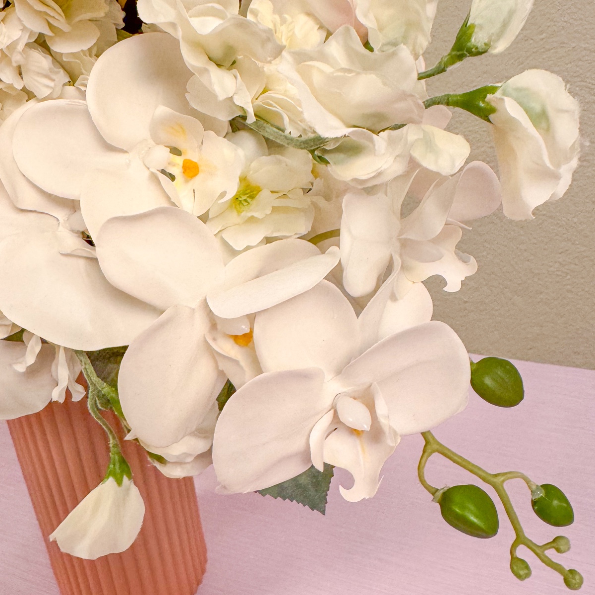Des roses et des orchidées ! Pour son mariage de rêve, il ne manquait plus à Céline que le bouquet de mariée idéal. Elle voulait des roses tendres et luxuriantes, rehaussées d'une touche d'orchidées exotiques : un bouquet romantique, élégant et original. Le résultat : une œuvre d'art florale qui correspondait parfaitement à ce grand jour. Shop the look !