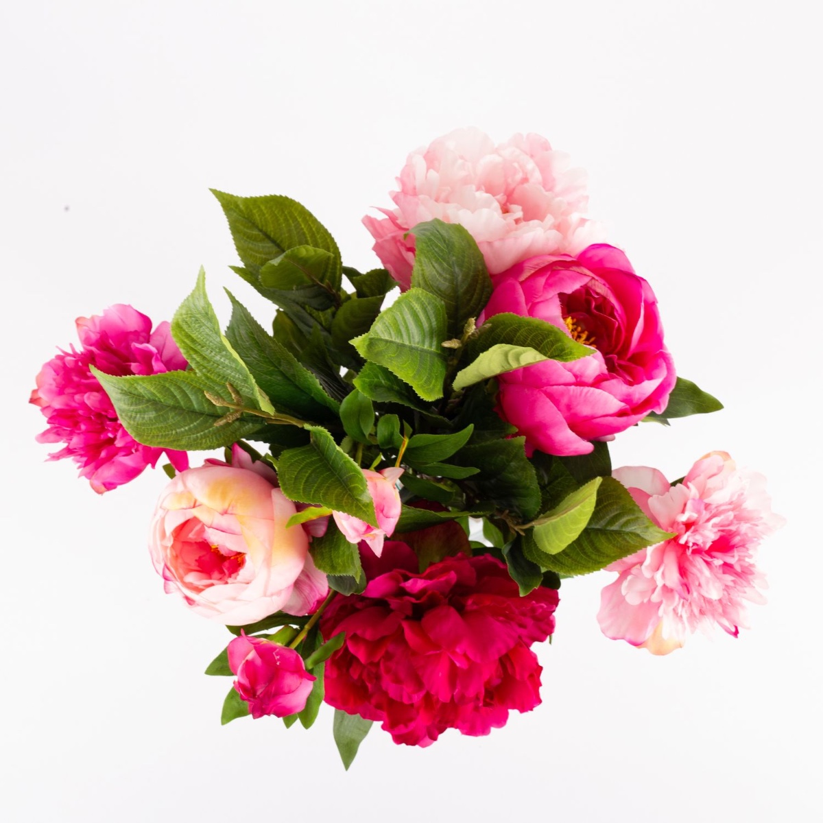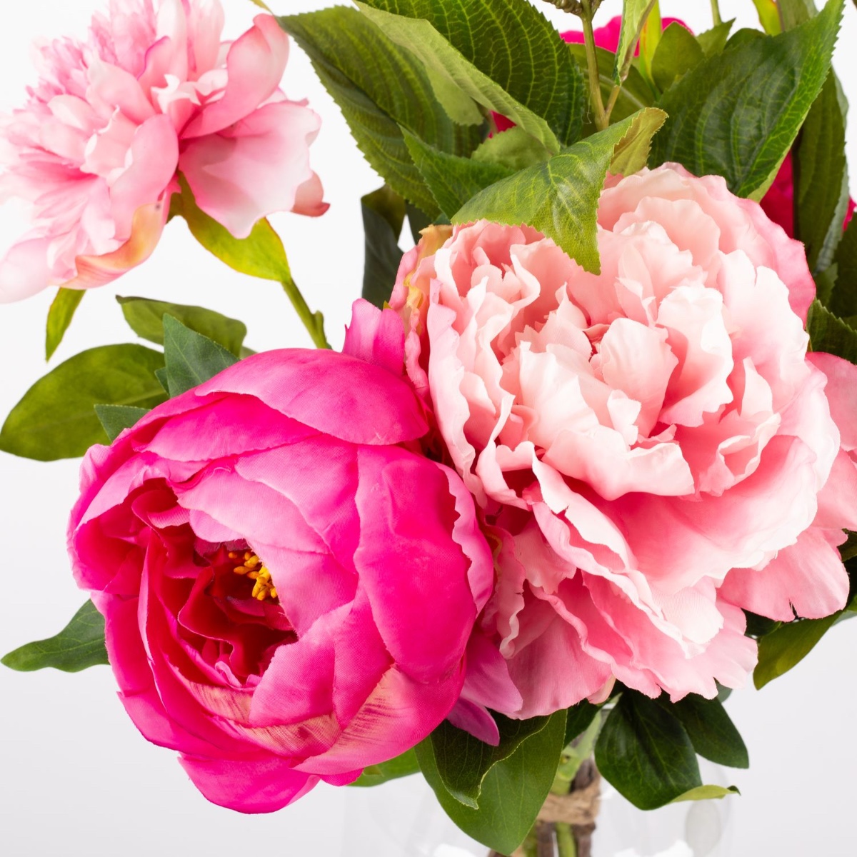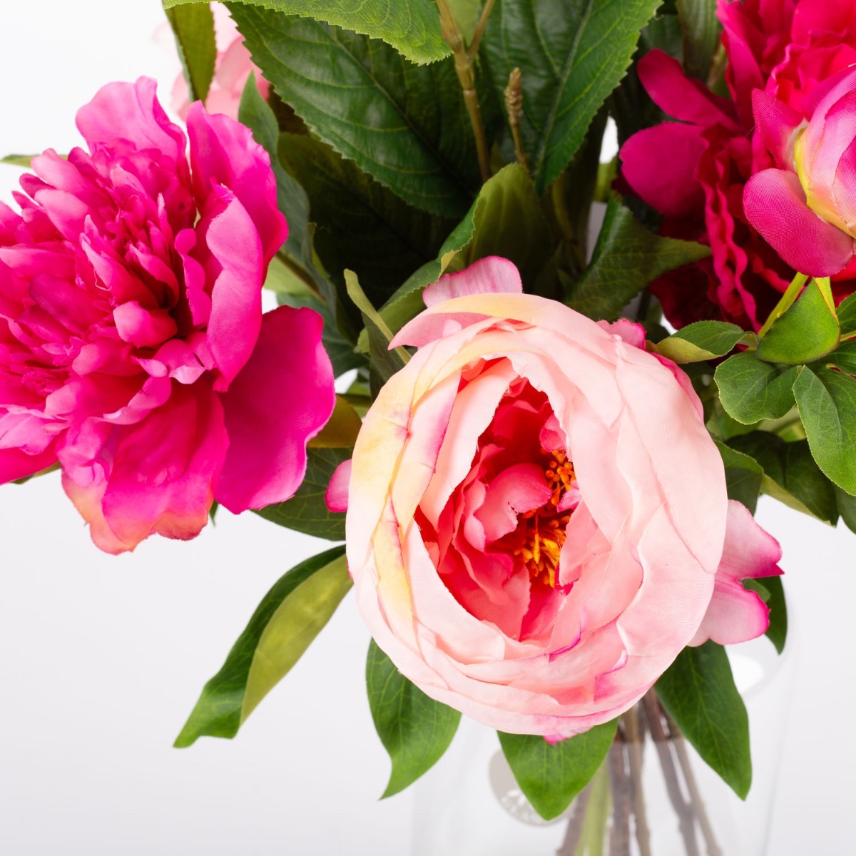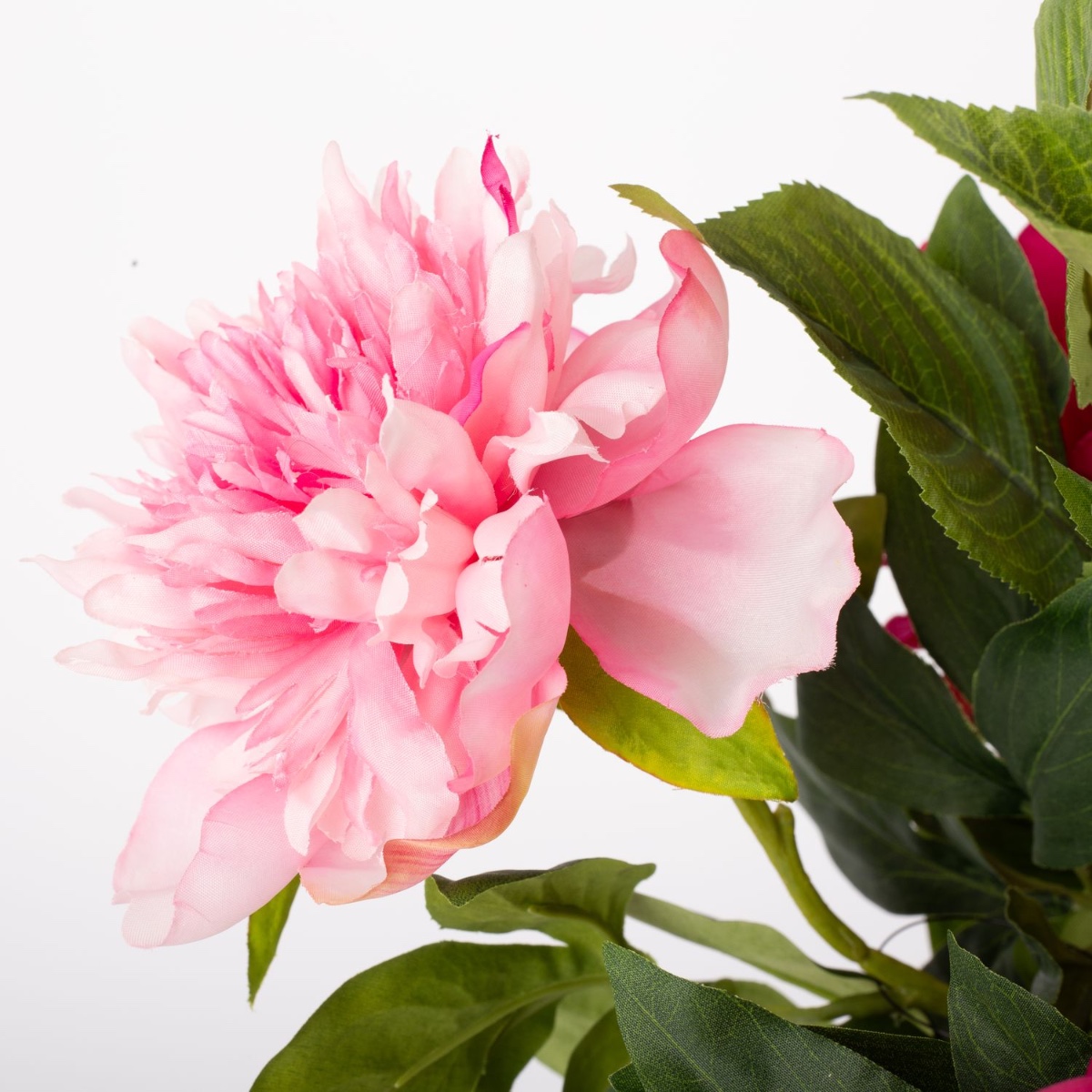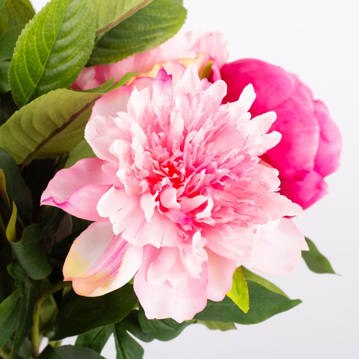 Du fuchsia au rose pâle. Les pivoines, avec leurs fleurs volumineuses et abondantes, présentent presque toutes les nuances de rose, du fuchsia foncé au rose clair. Cette floraison pré-estivale convient parfaitement à la saison et apporte une touche de couleur fraîche à la pièce. Ce bouquet de pivoines semble si authentique qu'on dirait qu'il a été cueilli directement dans le jardin. Il faut le toucher pour se rendre compte qu'il s'agit de fleurs artificielles en tissu de grande qualité.