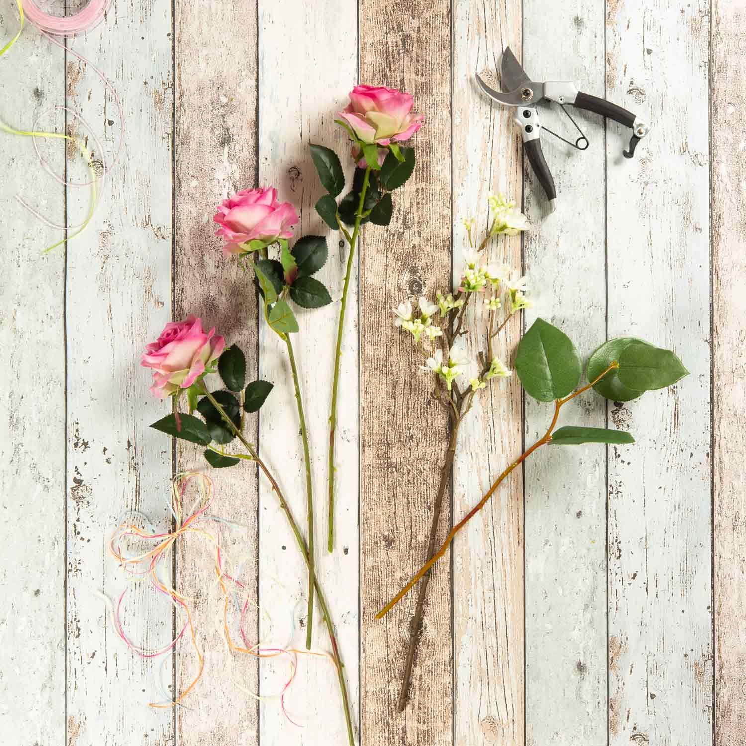- Liées avec un ruban crêpe vert, les fleurs et les branches peuvent être raccourcies individuellement ou utilisées séparément pour des projets créatifs après l'enlèvement du ruban crêpe
