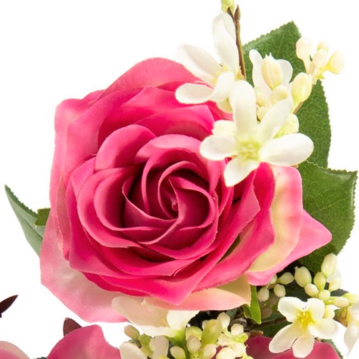 Le petit bouquet artificiel lié à la main en Allemagne SIMONY est composé de 3 roses de couleur rose-fuchsia. La composition artificielle est entourée de la fleur sept fils du Zhejiang et complétée par la branche de feuille de pommier. Ce bouquet de fleurs artificielles décorera votre vase de table à diverses occasions festives telles que la Saint-Valentin, un anniversaire ou en complément d'un cadeau d'anniversaire, et bien plus encore.
