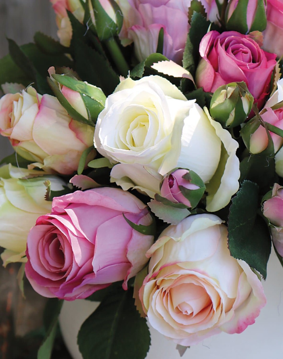 Joli bouquet de roses MOLLY, de couleur crème-vieux rose pour une ravissante décoration de table. Ce faux bouquet mesure environ 28 cm de haut et 25 cm de diamètre.