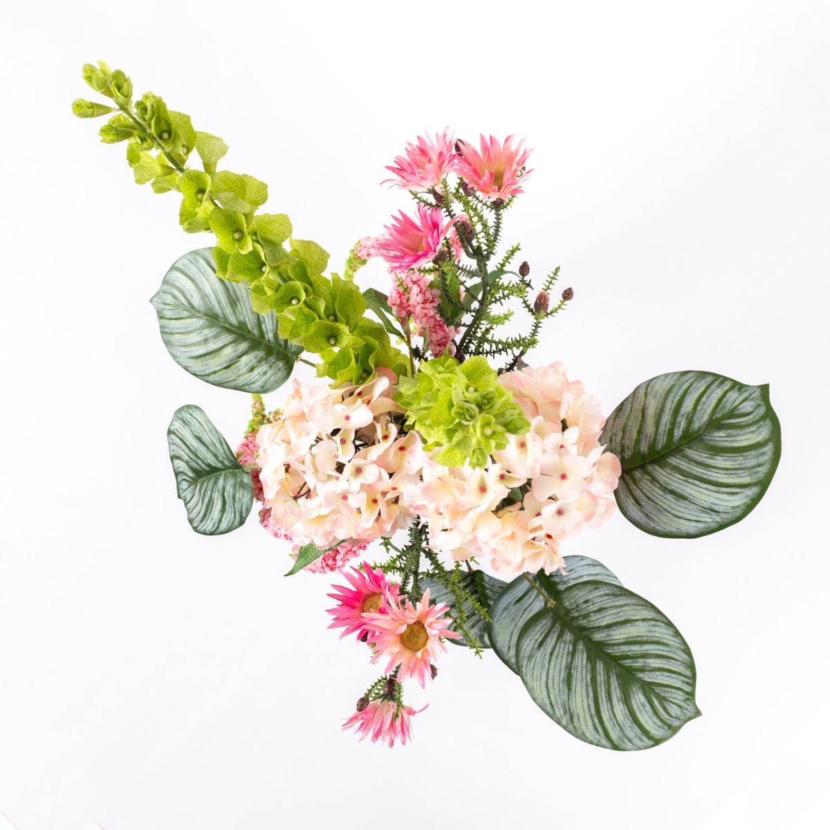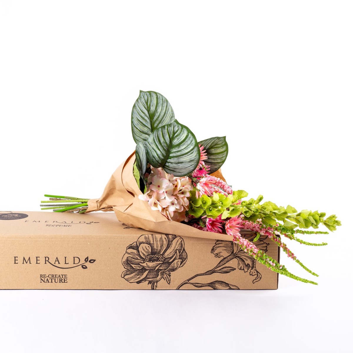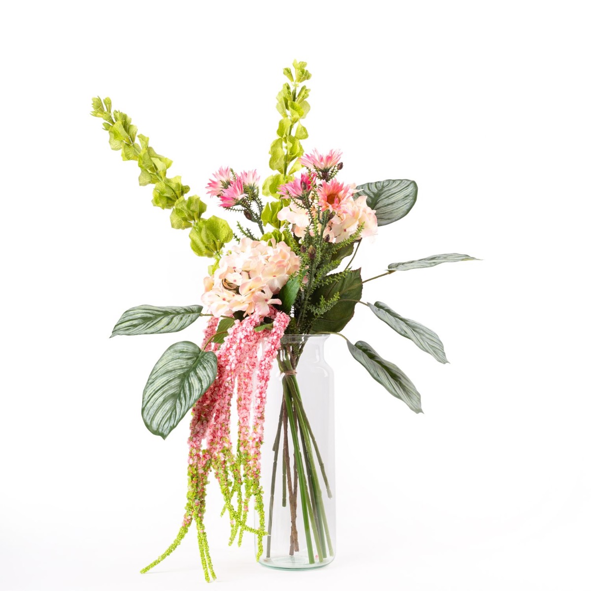 Un bouquet estival moderne PRIJA composé de fleurs du monde entier qui illumine chaque pièce grâce à son rose vif et ses feuilles de calathea qui l'encadrent. La branche d'amarante ressemble à une cascade et met en valeur l'hortensia luxuriant. Si vous aimez les fleurs, vous adorerez ce bouquet ! Que ce soit pour offrir ou simplement pour vous faire plaisir, ce bouquet noué à la main s'intègre à tous les intérieurs !
