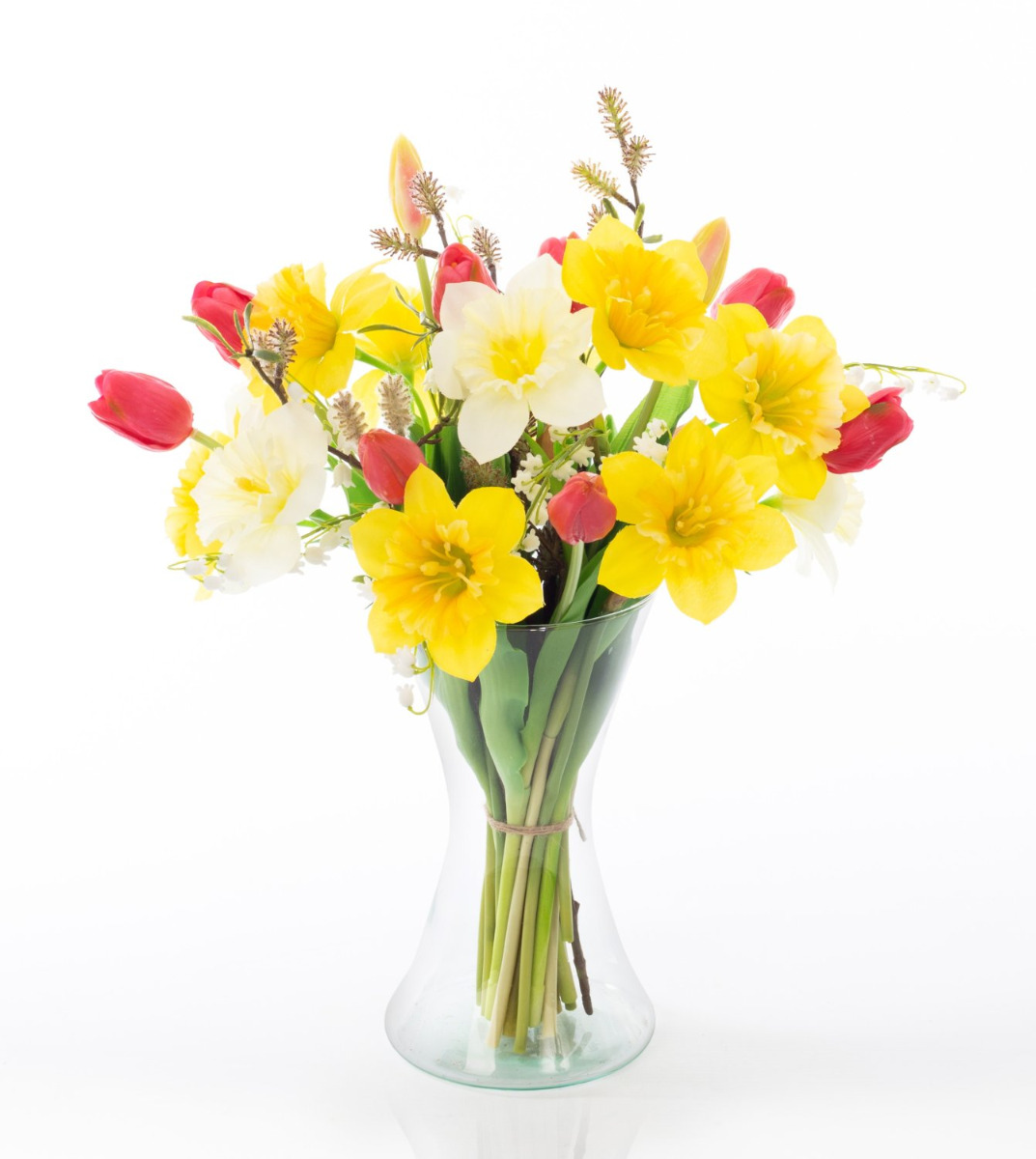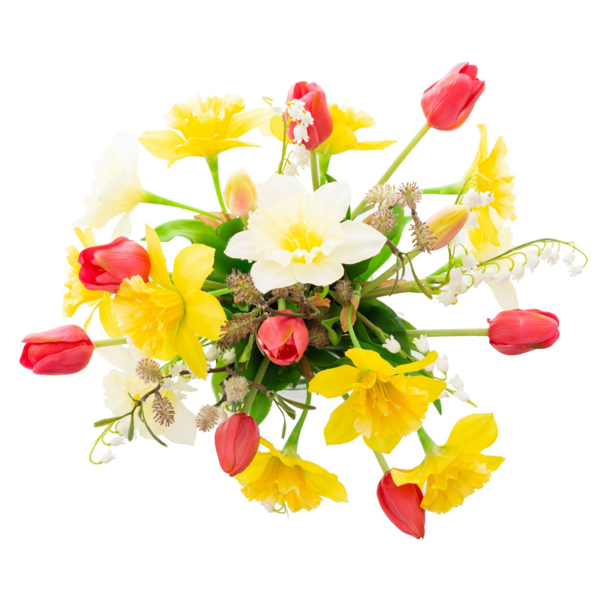 Le bouquet de fleurs artificielles MANULA a la hauteur idéale pour être placé par exemple sur la table de la salle à manger. Les fleurs multicolores composées de narcisse, de tulipe et de muguet sont des fleurs typiques du printemps, qui sont complétées de manière ludique par une branche de saule avec chatons.