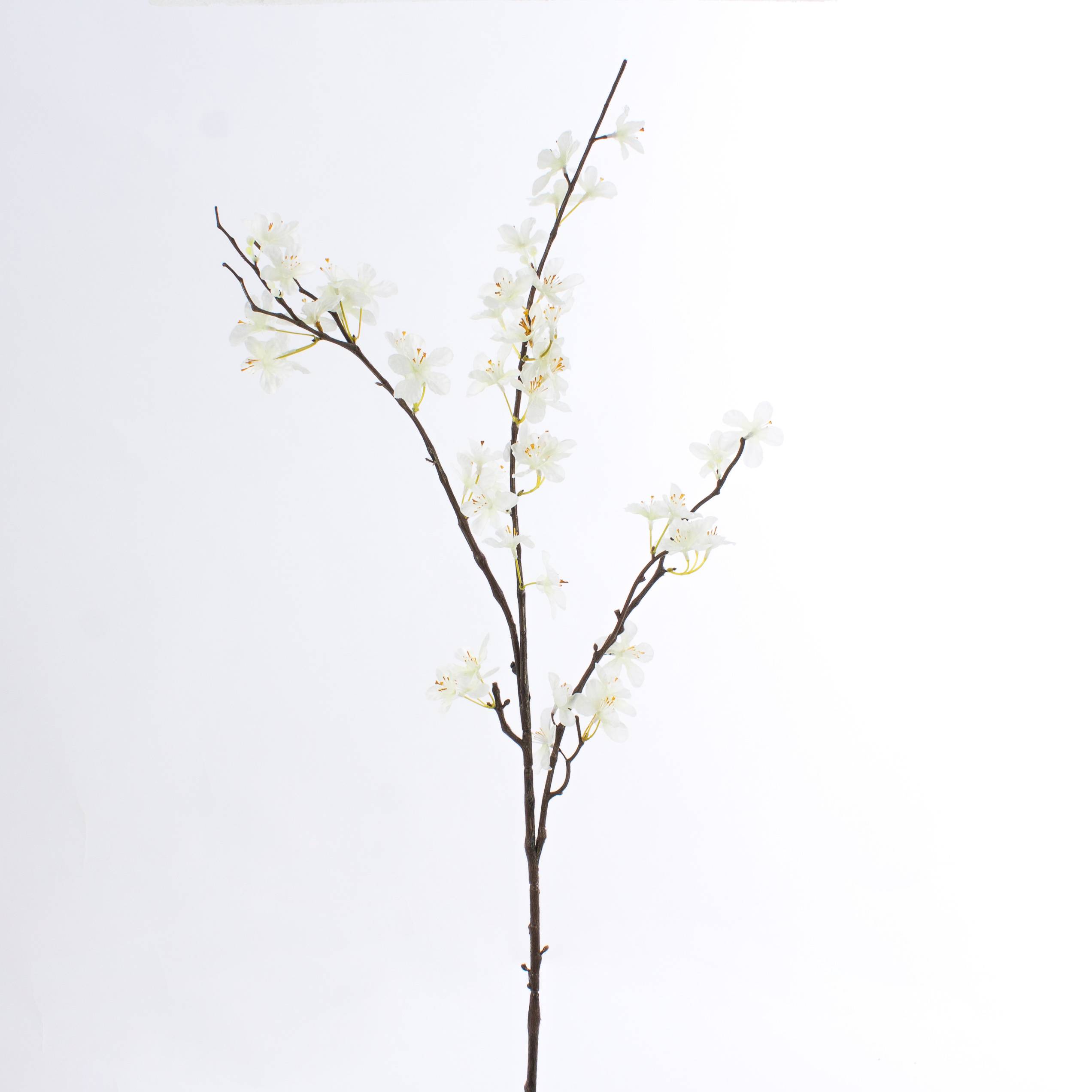 Jolie branche artificielle pourvue de fleurs de pommier de couleur blanc crème et mesurant au total environ 85 cm de long.