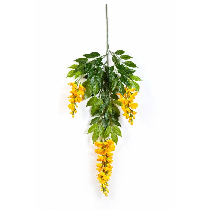 Branche de glycine artificielle pourvue de fleurs de couleur jaune et environ 80 feuilles vertes. Cette branche décorative mesure au total env. 85 cm de longueur.