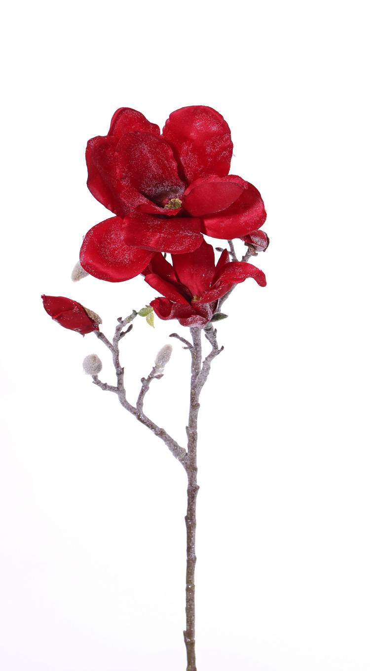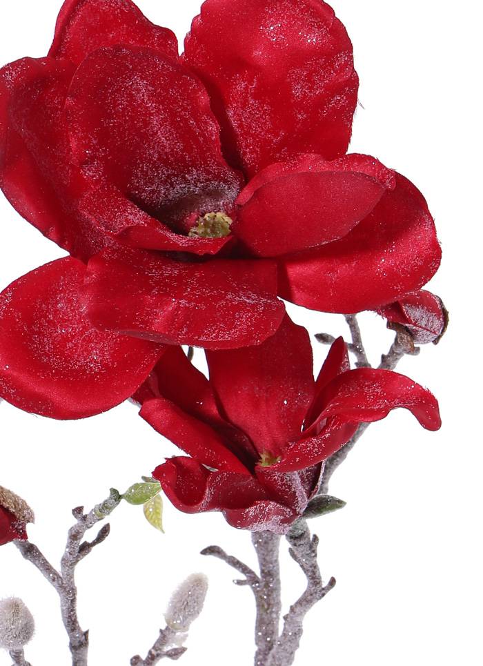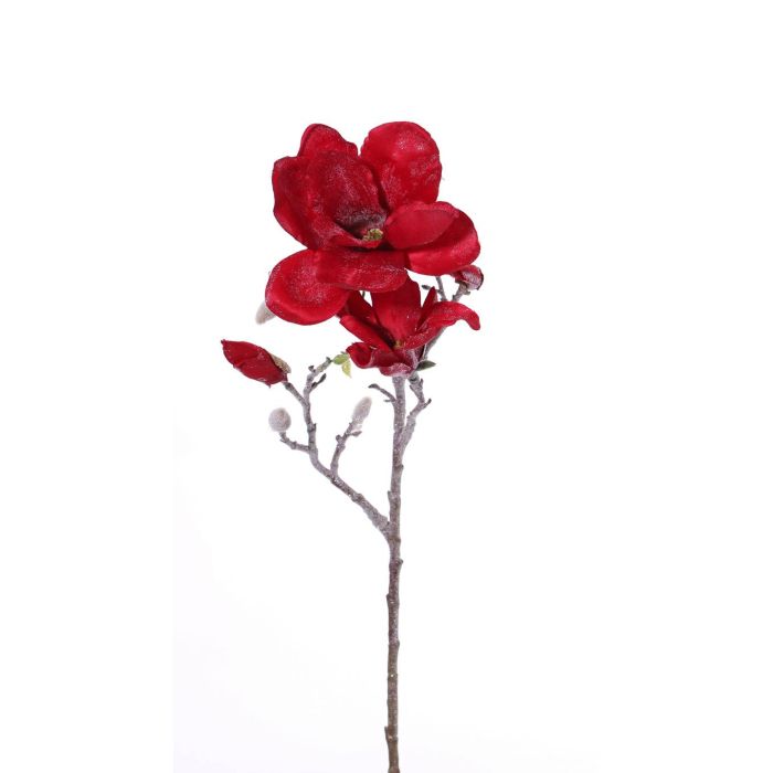 La branche de magnolia artificielle SIMKA a une longueur totale d'environ 60 cm. Cette branche décorative d'aspect givré est pourvue d'environ 2 grandes fleurs de tailles différentes, d'environ 2 boutons ouverts et d'environ 5 boutons fermés de couleur rouge.