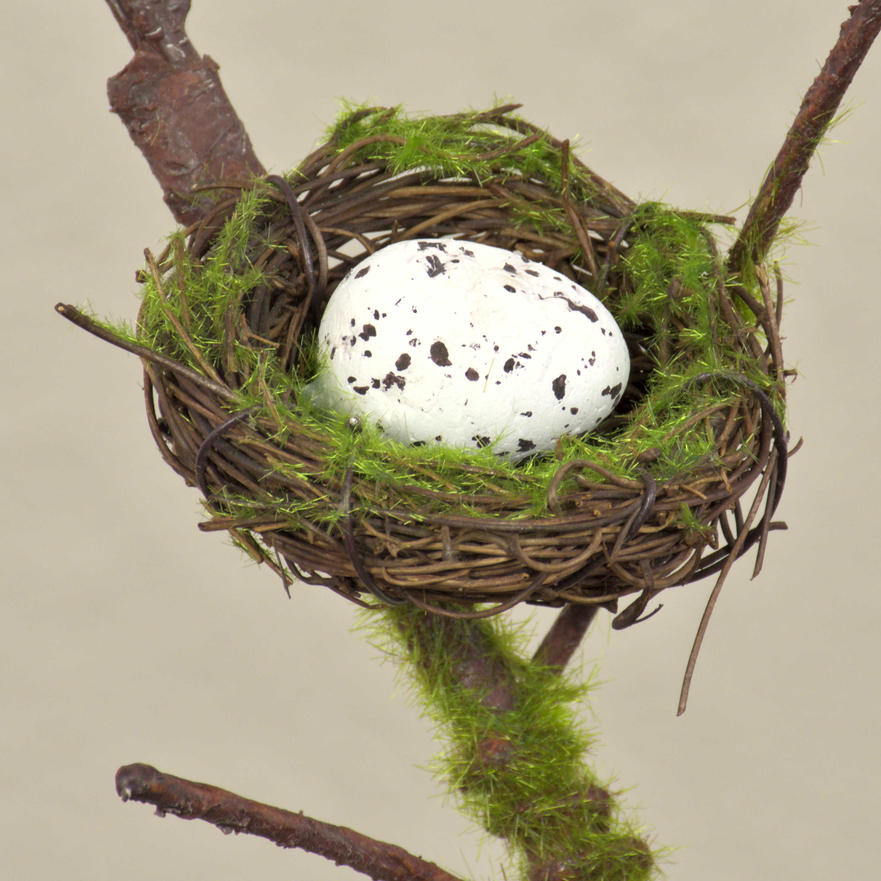 - La branche d'aspect naturel est partiellement recouverte de mousse, un nid d'oiseau avec un œuf tacheté est fixé dans une fourche