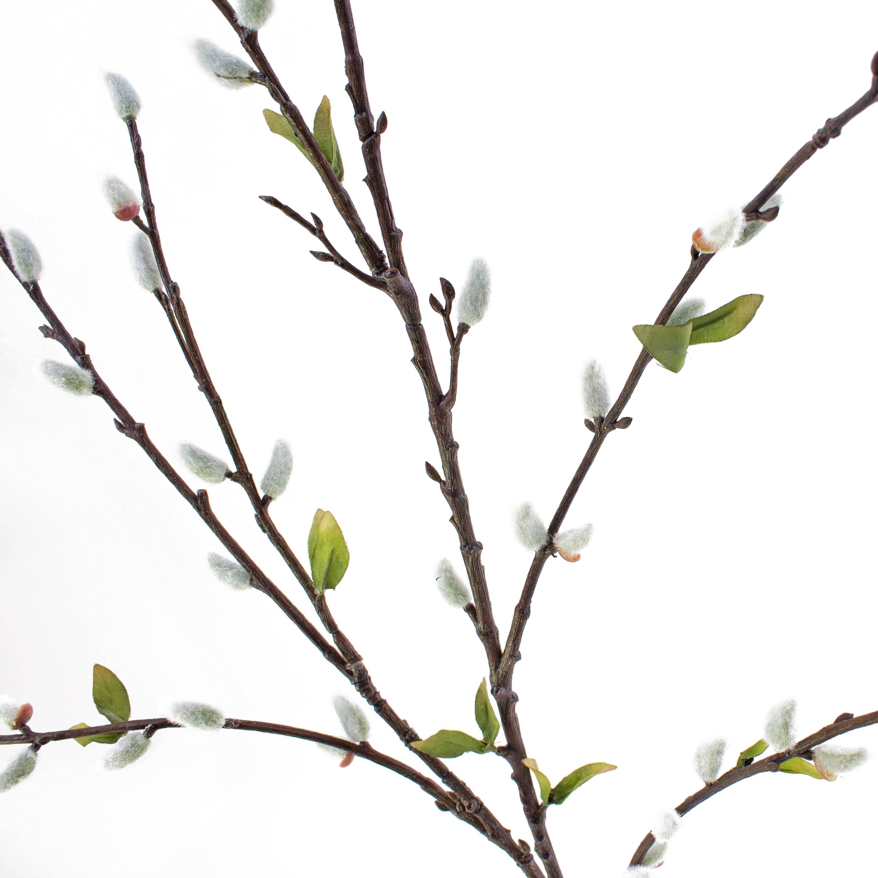 Branche de saule synthétique pourvue de nombreux chatons gris mesurant au total environ 120 cm de long. Idéale accrochée au mur ou dans un vase pour une déco de Pâques par exemple.
