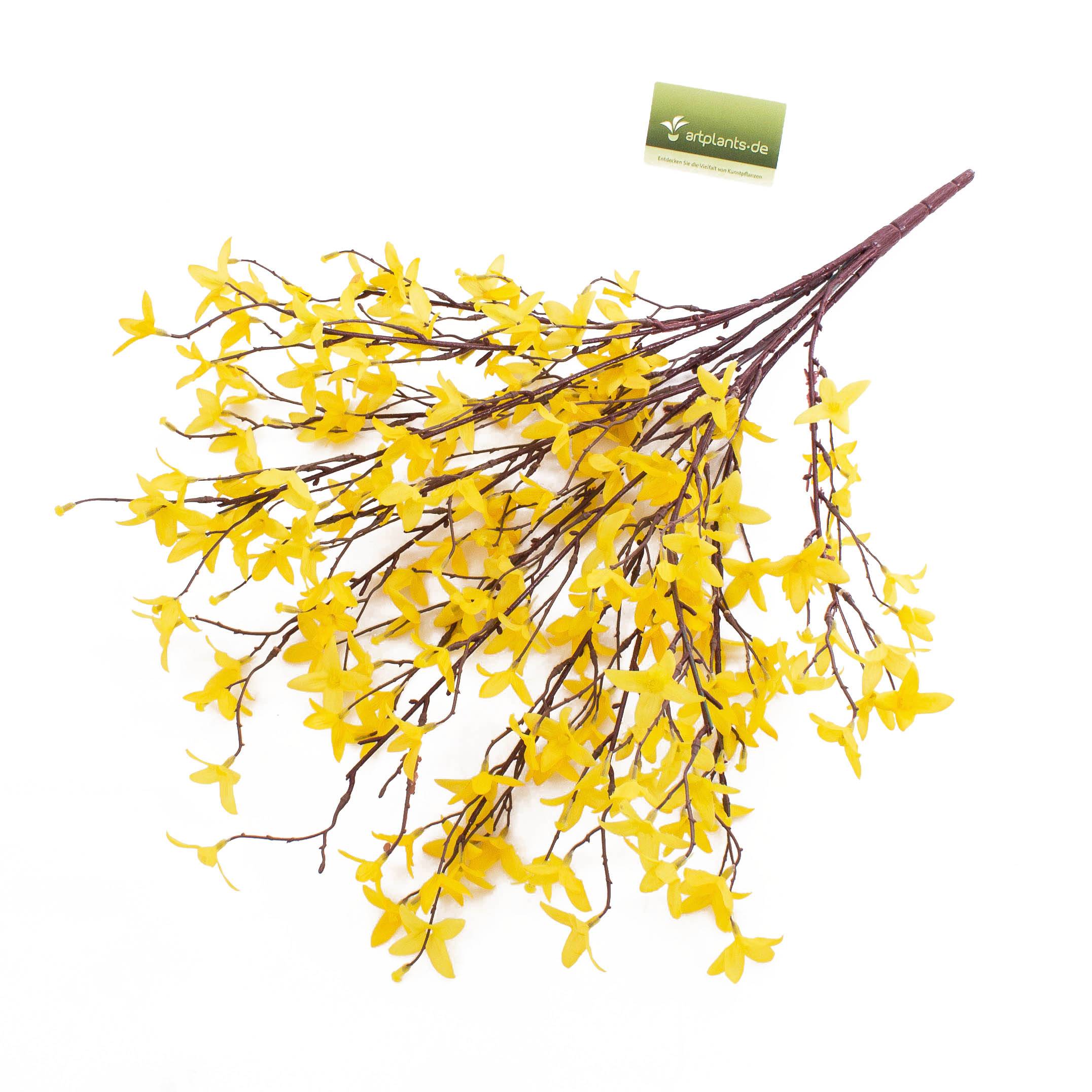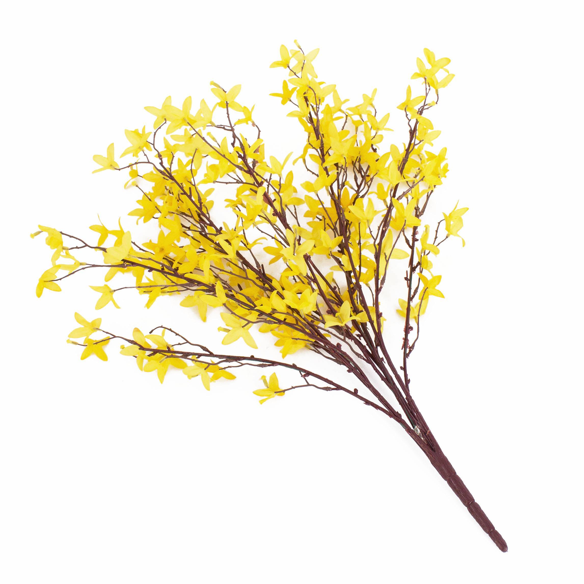 Buisson de forsythia synthétique orné de petites fleurs jaunes. Cette branche artificielle fleurie mesure au total environ 60 cm de long.