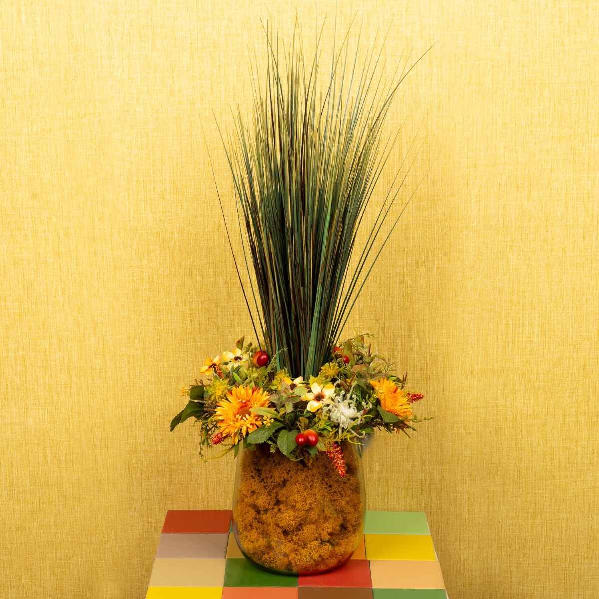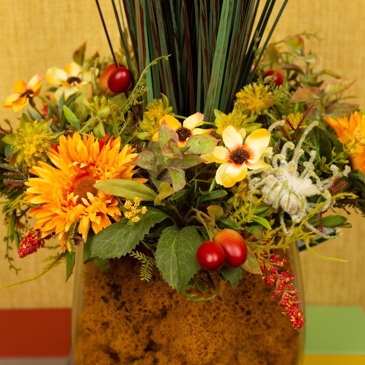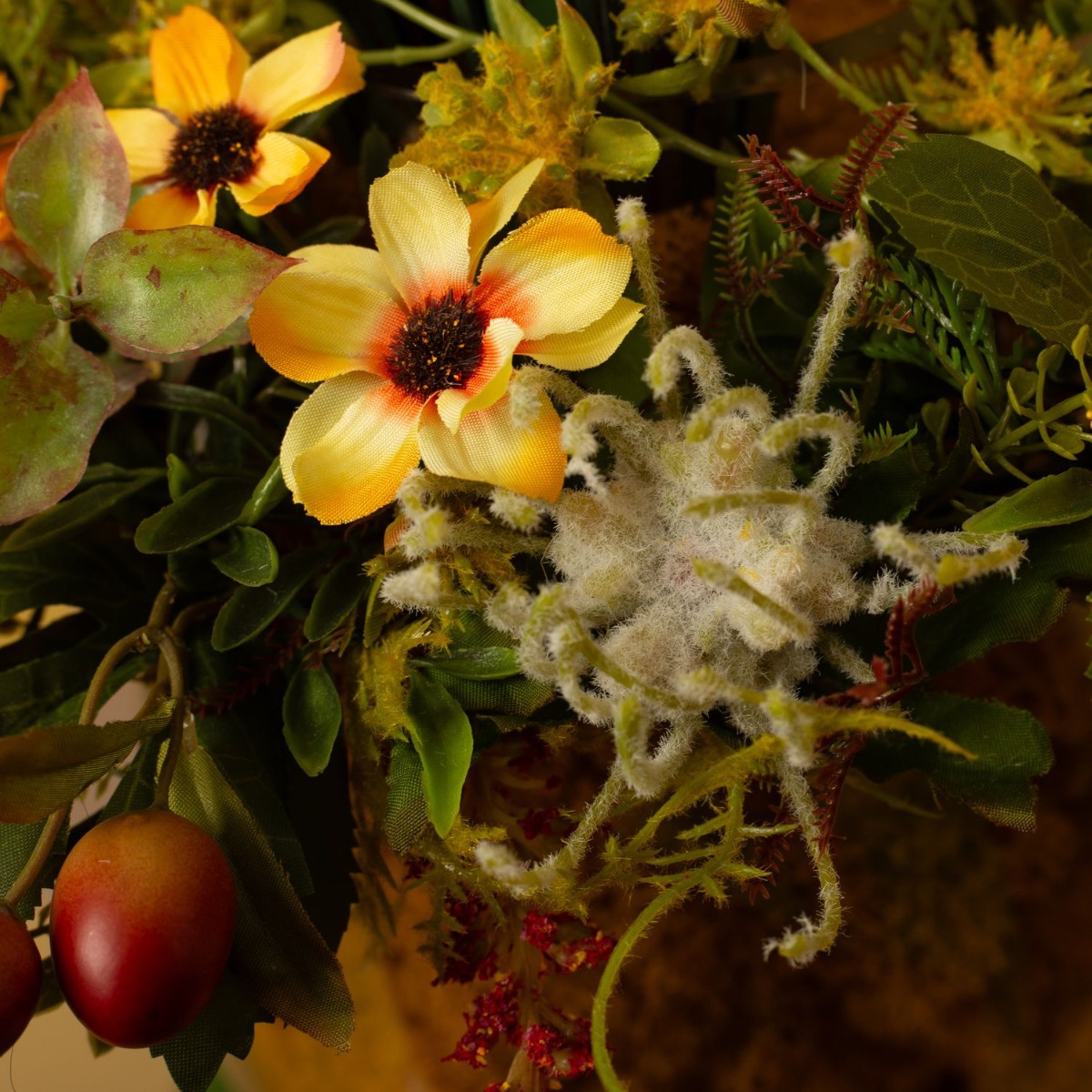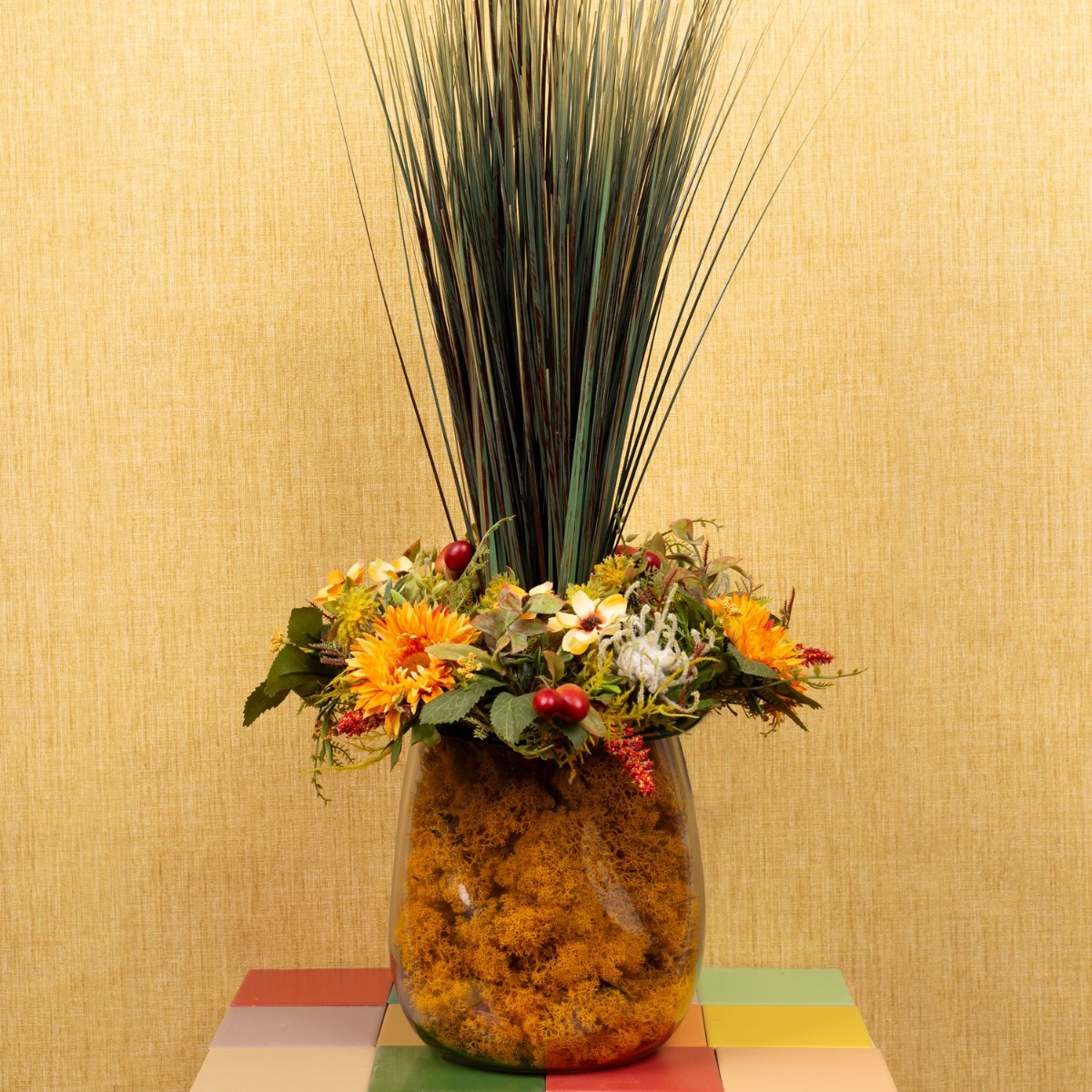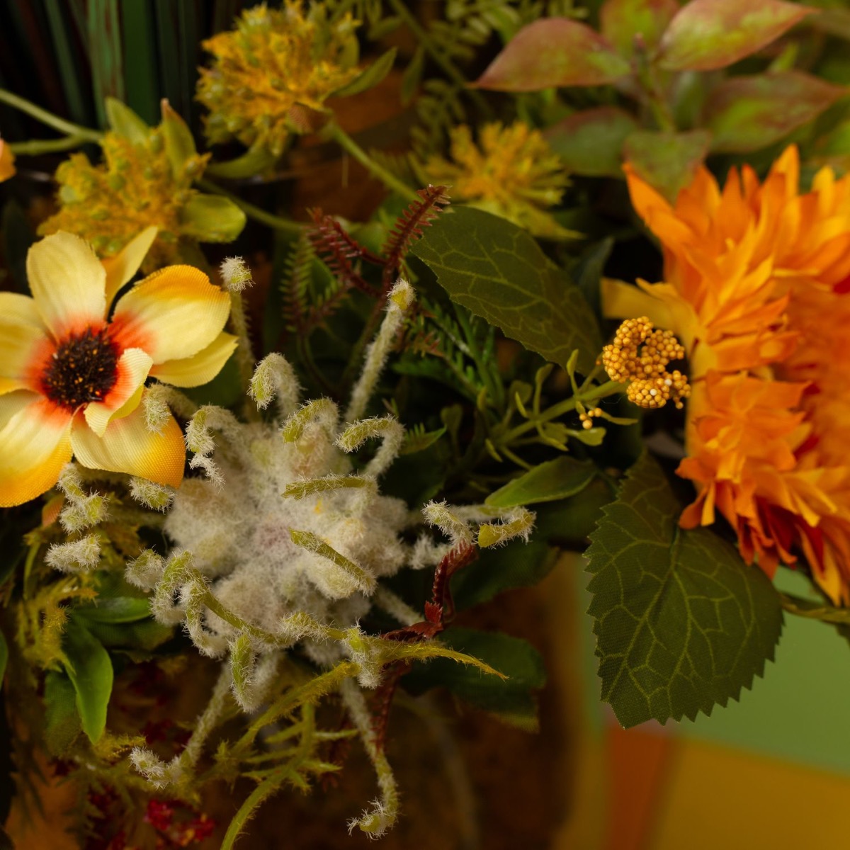 L'orange et le vert ! Ce look d'automne est conçu de manière simple et pourtant très efficace. Une couronne d'automne colorée, composée de fleurs typiques de l'automne, orne le vase insolite au design bosselé. Au centre, le vulpin vert-brun dépasse et fait briller le look. Shop the look!