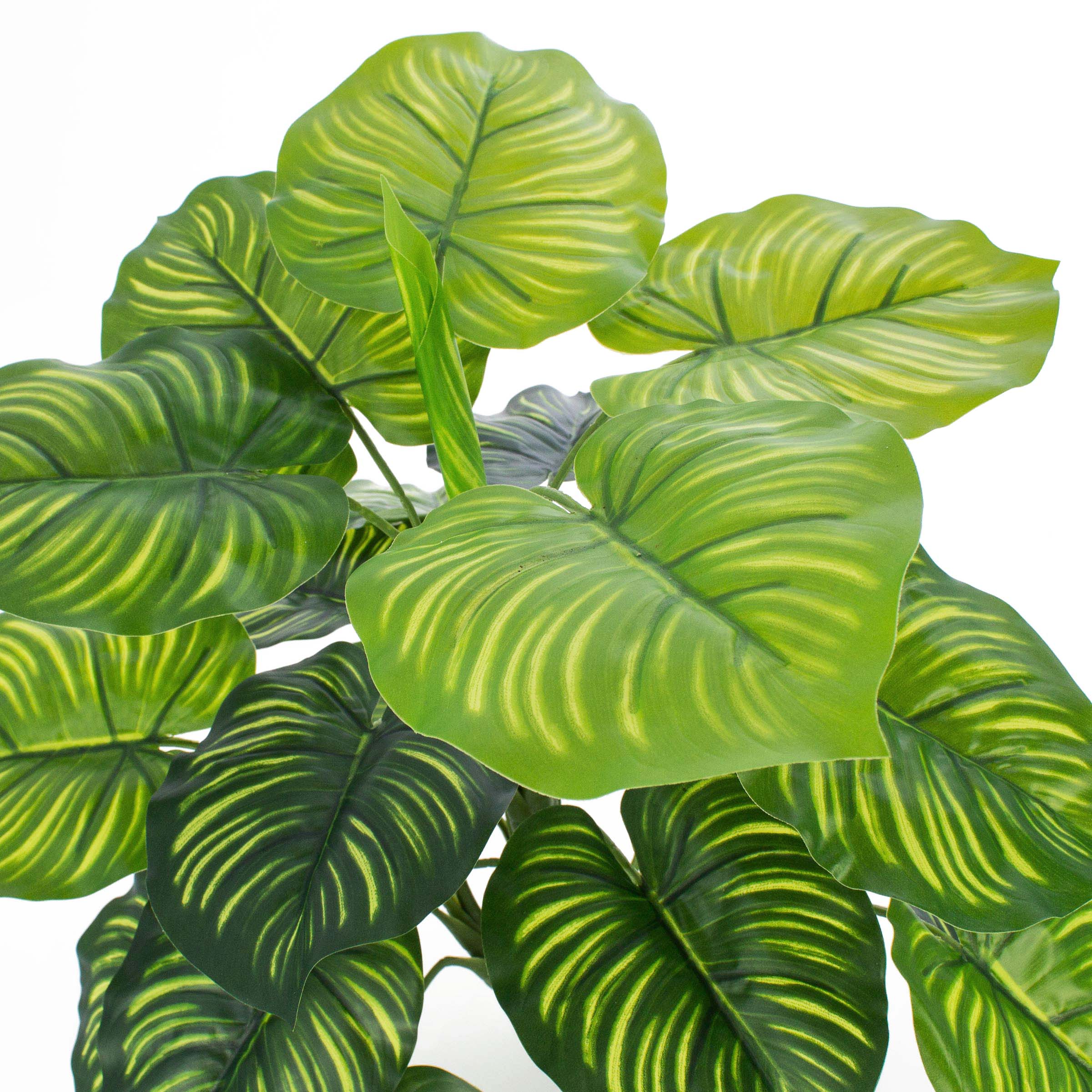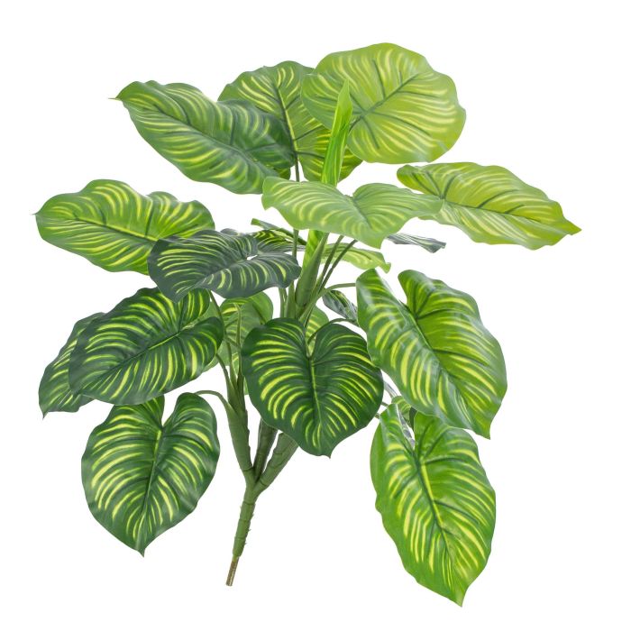 Ce calathea artificiel se caractérise par ses nervures de couleur vert clair et foncé sur des feuilles rondes en forme de coeur en combinaison avec des fibres de feuilles de couleur vert foncé, qui le rendent très naturel. La plante artificielle mesure environ 45 cm de haut.