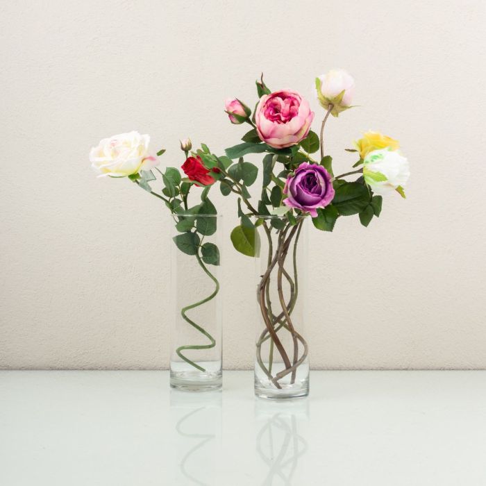 Coloré et pittoresque ! Quand on pense aux fleurs artificielles, on pense immédiatement aux roses artificielles que l'on peut tirer sur une fête foraine. Mais nous savons qu'il existe des roses artificielles vraiment extraordinaires, fabriquées de haute qualité et presque plus belles que les vraies. Les différentes roses sont courbées de telle sorte qu'elles dépassent des vases cylindriques comme des vrilles, créant ainsi un look enjoué. La Belle au bois dormant ne se rendormira pas ! Shop the Look!