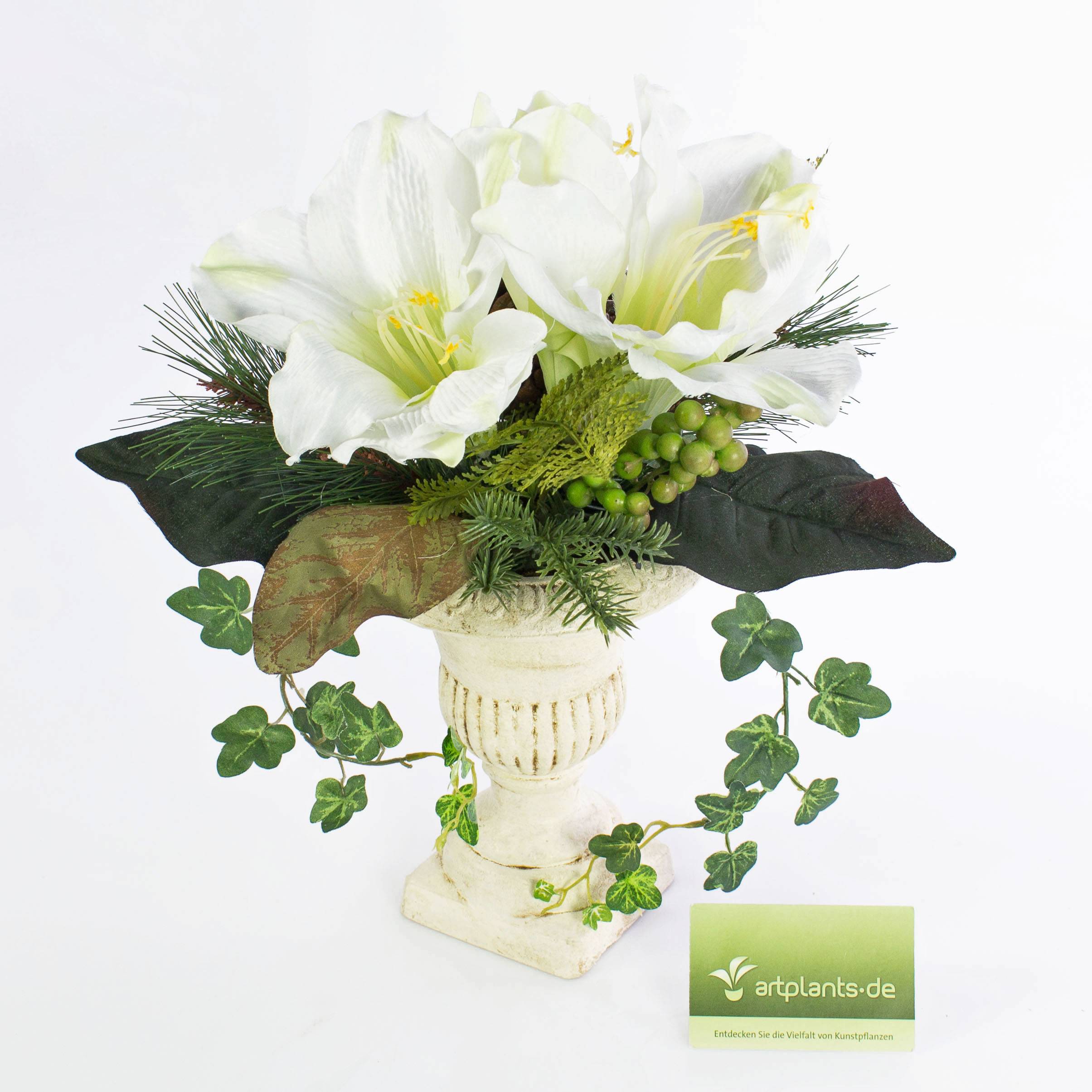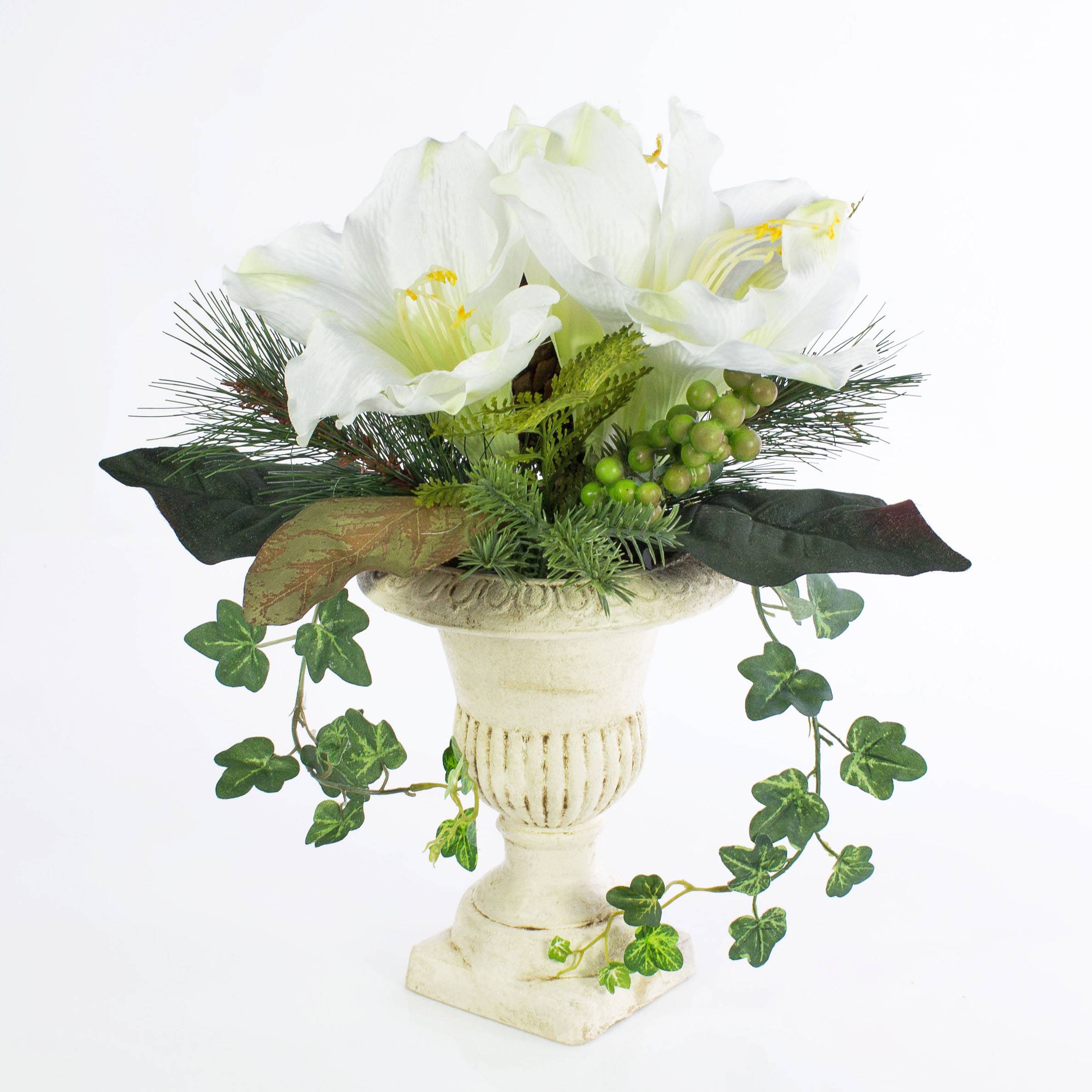 Composition florale artificielle de couleur blanche composée d'amaryllis et de baies. Le bouquet de grande qualité a une hauteur totale d'environ 35 cm et décorera parfaitement votre intérieur.
