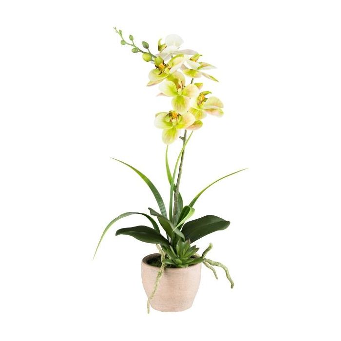 Composition florale artificielle d'orchidée et d'aeonium FININ, herbe, pot en ciment, racines, vert-blanc, 45cm