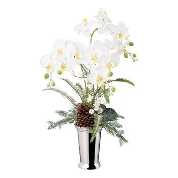 Composition florale artificielle d'orchidée et de fougère BALSI, vase en céramique, pomme de pin, baies, enneigée, blanc, 70cm