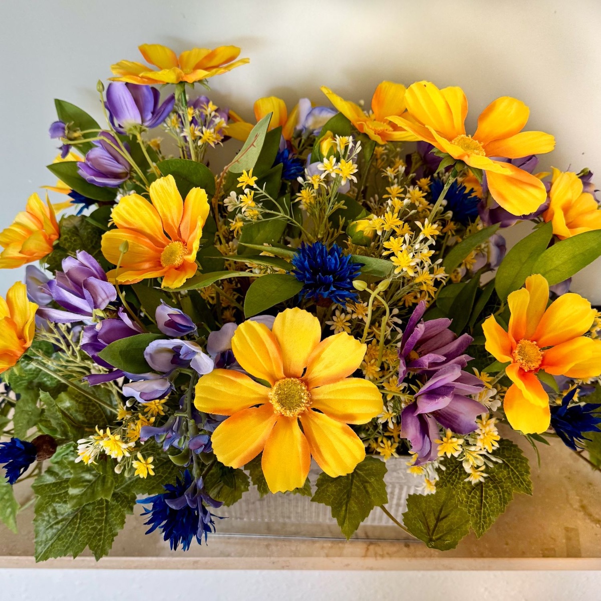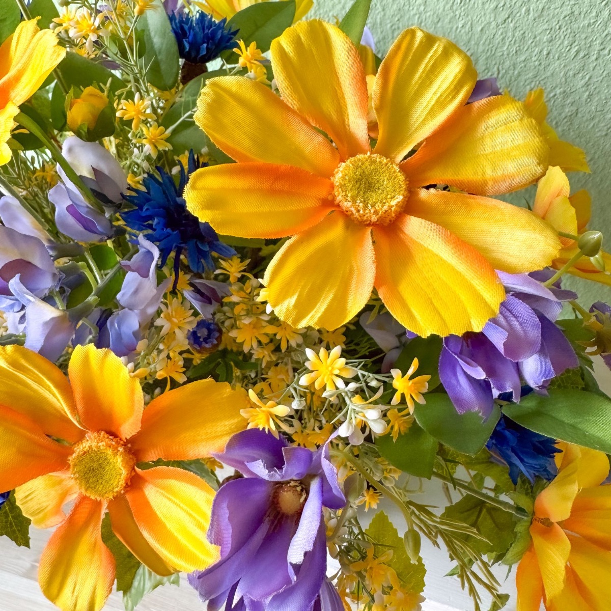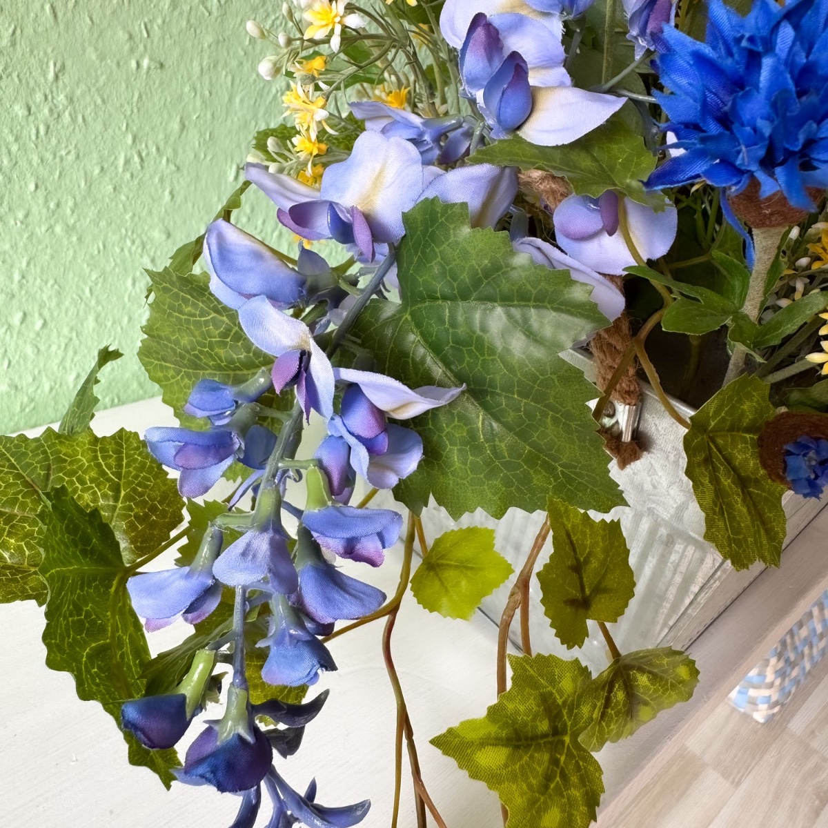 Amour des fleurs sauvages ! Nous avons reçu la deuxième demande de notre client Hans-Peter. Cette fois-ci, il avait besoin d'une composition florale pour un centre de table baroque doré avec des fleurs stylisées. Il souhaitait des bleuets bleus et d'autres fleurs jaune vif et lilas, ainsi que des feuilles de vigne assorties au centre de table. Pour une réalisation parfaite, il nous a renvoyé le insert du récipient afin que nous puissions y fixer la mousse florale avec précision. Nous avons complété les bleuets avec des cosmos, de l'aneth et des branches de glycine. Chaque branche a été raccourcie et divisée en plusieurs tiges florales. Nous les avons insérés de manière synchronisée de l'intérieur vers l'extérieur dans la mousse florale afin d'obtenir une répartition homogène. La vigne et la glycine ont trouvé leur place sur les côtés courts du récipient. Nous avons envoyé quelques photos de notre premier exemplaire à notre client. Hans Peter a été ravi et a immédiatement passé commande. Vous souhaitez vous aussi une composition artificielle extravagante ? Shop the Look !
