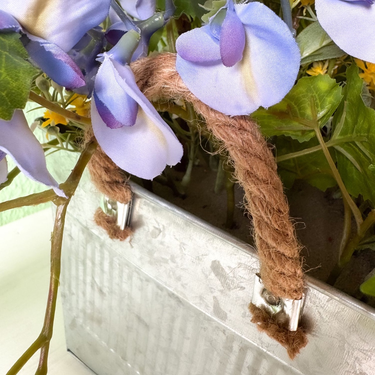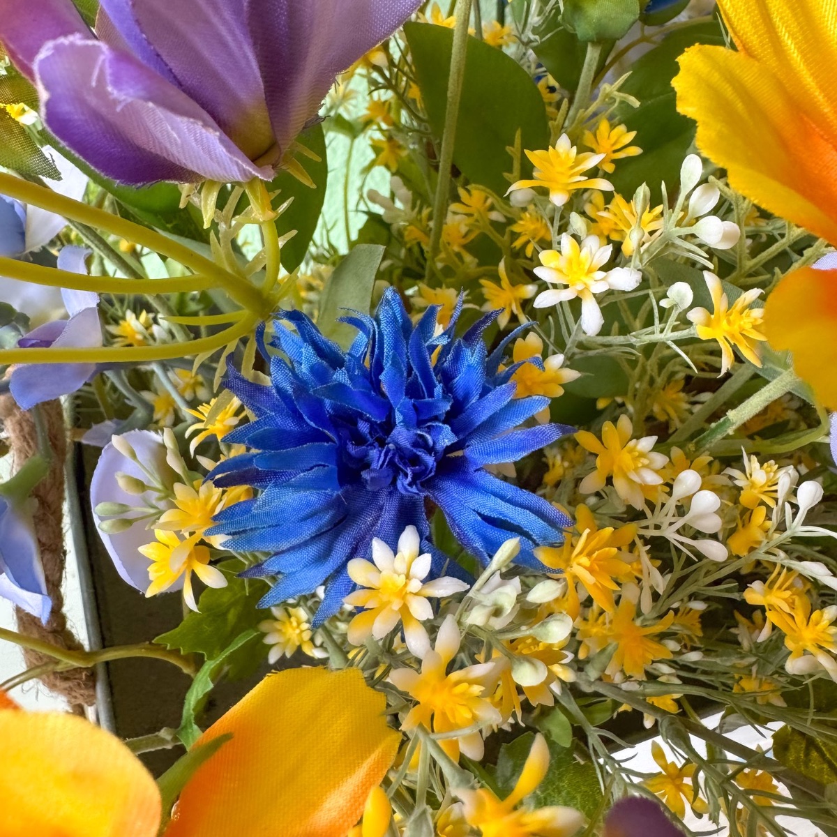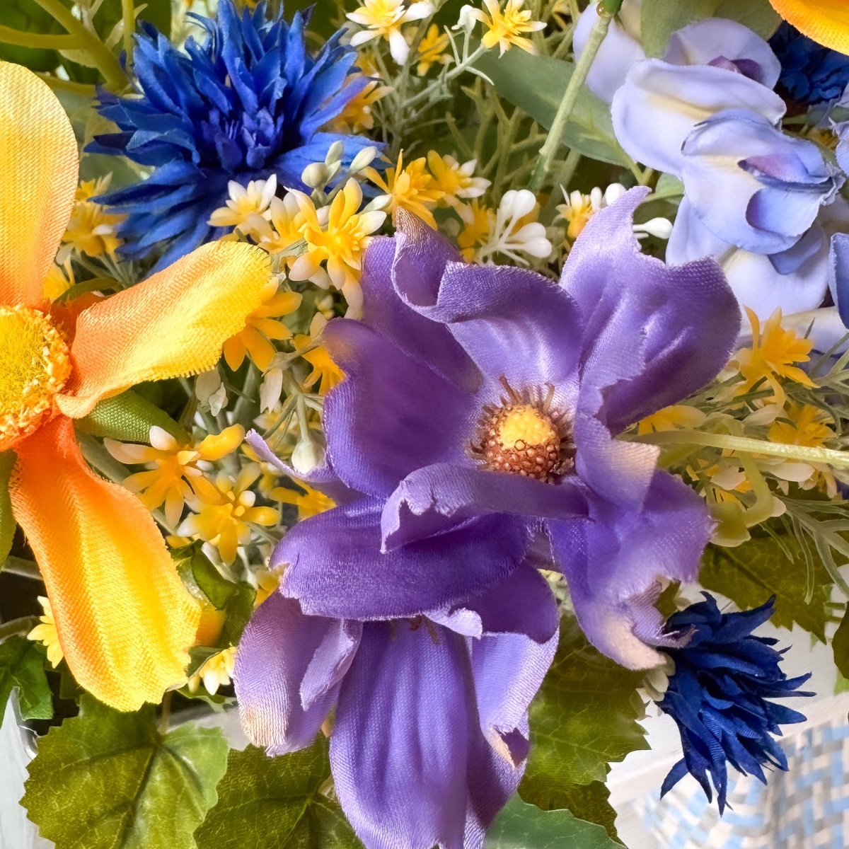 Amour des fleurs sauvages ! Nous avons reçu la deuxième demande de notre client Hans-Peter. Cette fois-ci, il avait besoin d'une composition florale pour un centre de table baroque doré avec des fleurs stylisées. Il souhaitait des bleuets bleus et d'autres fleurs jaune vif et lilas, ainsi que des feuilles de vigne assorties au centre de table. Pour une réalisation parfaite, il nous a renvoyé le insert du récipient afin que nous puissions y fixer la mousse florale avec précision. Nous avons complété les bleuets avec des cosmos, de l'aneth et des branches de glycine. Chaque branche a été raccourcie et divisée en plusieurs tiges florales. Nous les avons insérés de manière synchronisée de l'intérieur vers l'extérieur dans la mousse florale afin d'obtenir une répartition homogène. La vigne et la glycine ont trouvé leur place sur les côtés courts du récipient. Nous avons envoyé quelques photos de notre premier exemplaire à notre client. Hans Peter a été ravi et a immédiatement passé commande. Vous souhaitez vous aussi une composition artificielle extravagante ? Shop the Look !