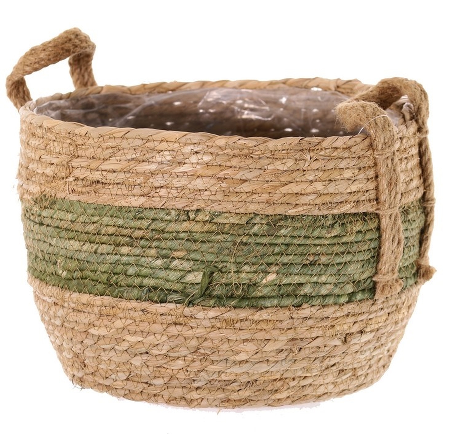 Corbeille / cache-pot UPALI, zostère liée, 2 poignées, beige-vert, 19cm, Ø24cm