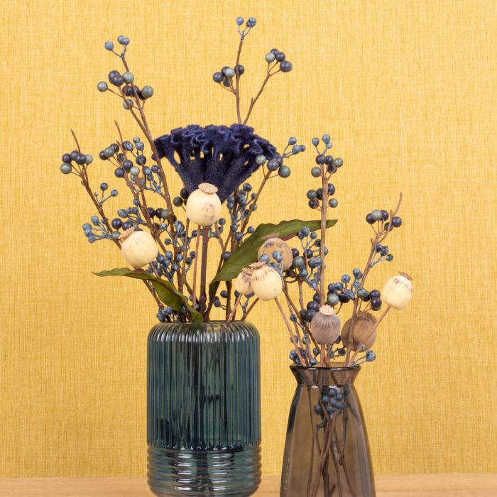 Bleu et brun dans le style maison de campagne! L'automne est la saison où les combinaisons de couleurs sont les plus intéressantes. Ici, nous avons combiné un bleu profond avec du brun et du vert pour donner au look une ambiance automnale appropriée. La célosie bleue brille derrière les branches et souligne les tons crème des capsules de pavot. Les branches du galutheria vibrantes apportent en outre du volume et de la vivacité au bouquet de fleurs. Voilà une bonne façon de terminer l'été. Shop the Look!