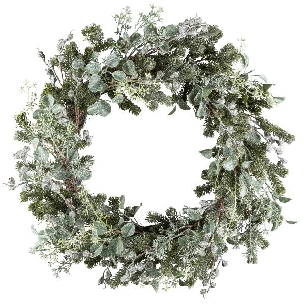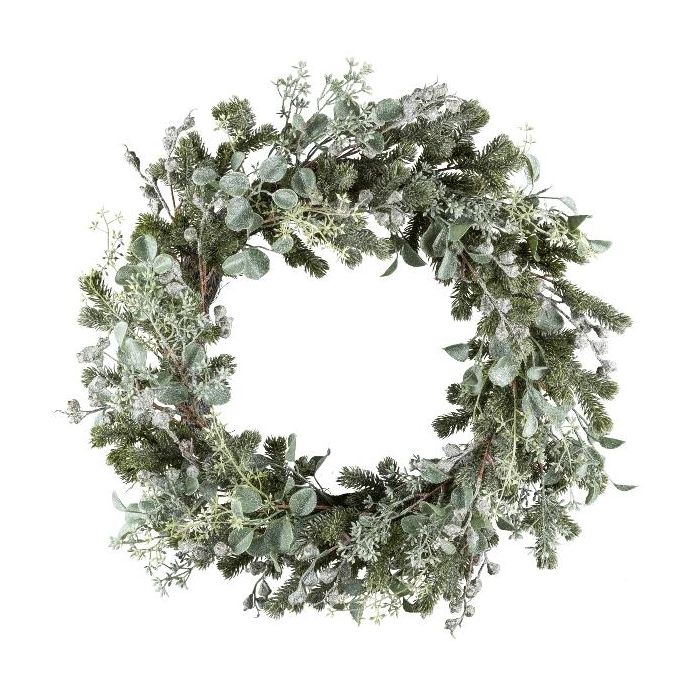 Couronne artificielle d'eucalyptus et de sapin DUVRA avec des fleurs, givré, vert-gris, Ø60cm