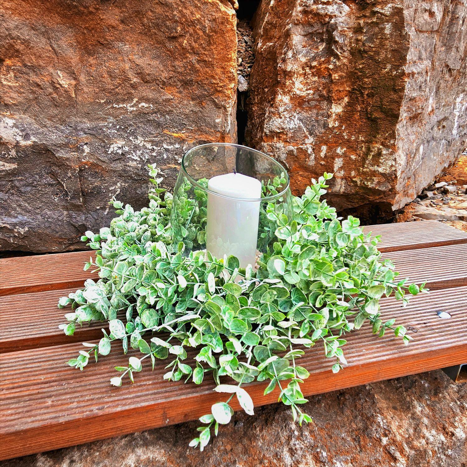 La fausse couronne d'eucalyptus JULERTE attirera tous les regards sur votre table basse ou sur le buffet en l'associant avec un verre à bougie chauffe-plat au milieu.