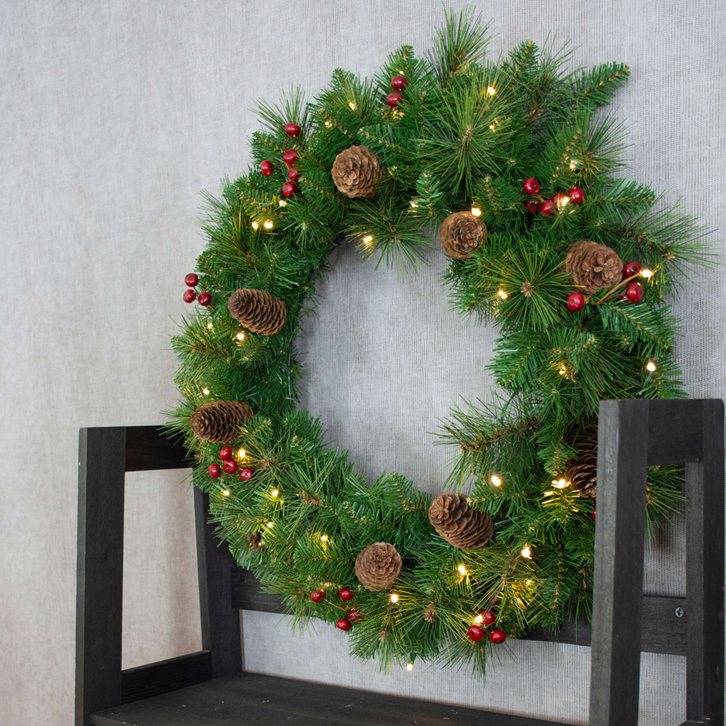 - Ornée de groseilles, de pommes de pin, d'une guirlande lumineuse (50 LEDs) et de 160 branches de conifères en matière PVC de grande qualité