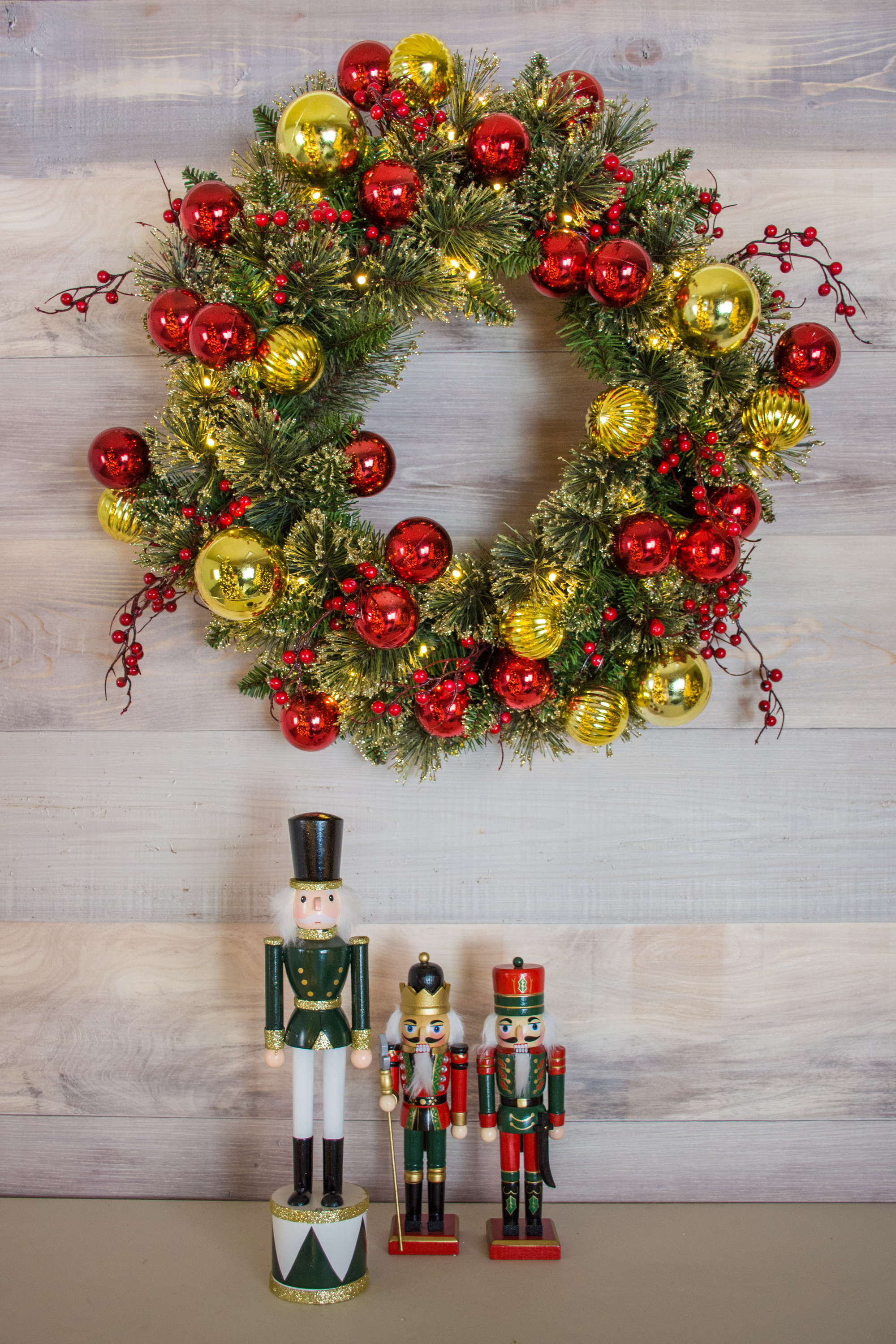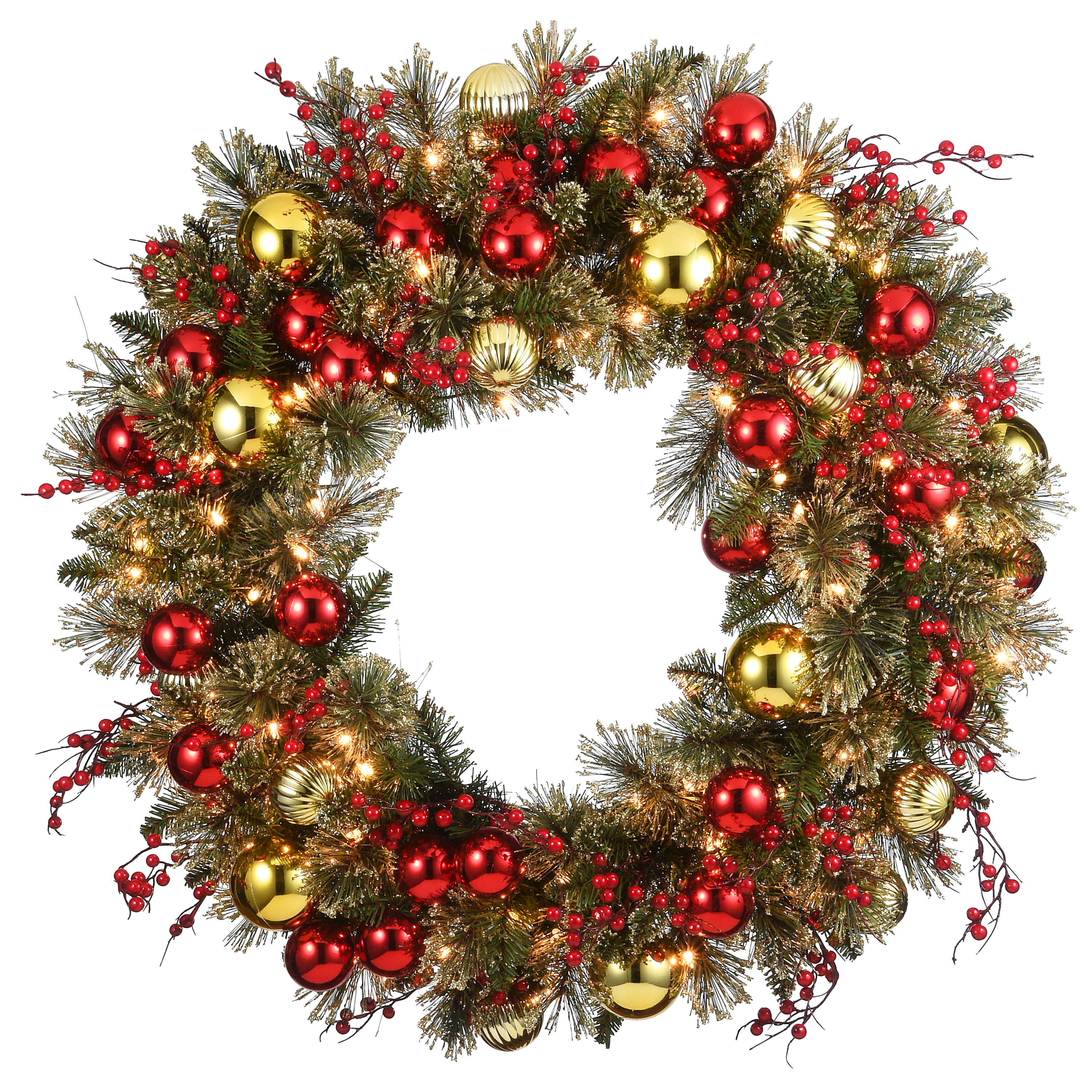 - Couronne artificielle décorée avec des branches de baies ainsi que des boules de Noël dorées et rouges et de nombreuses LEDs