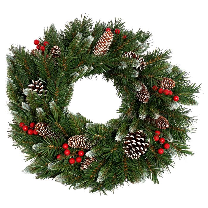 - Ornée de pommes de pin, de baies, de neige artificielle et de 125 branches de conifères en matière PVC de grande qualité