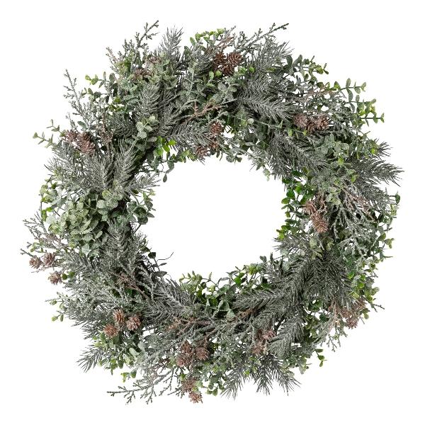 Couronne décorative d'eucalyptus, de sapin et de cyprès CAVRO, givré, pommes de pin, blanc-vert, Ø50cm