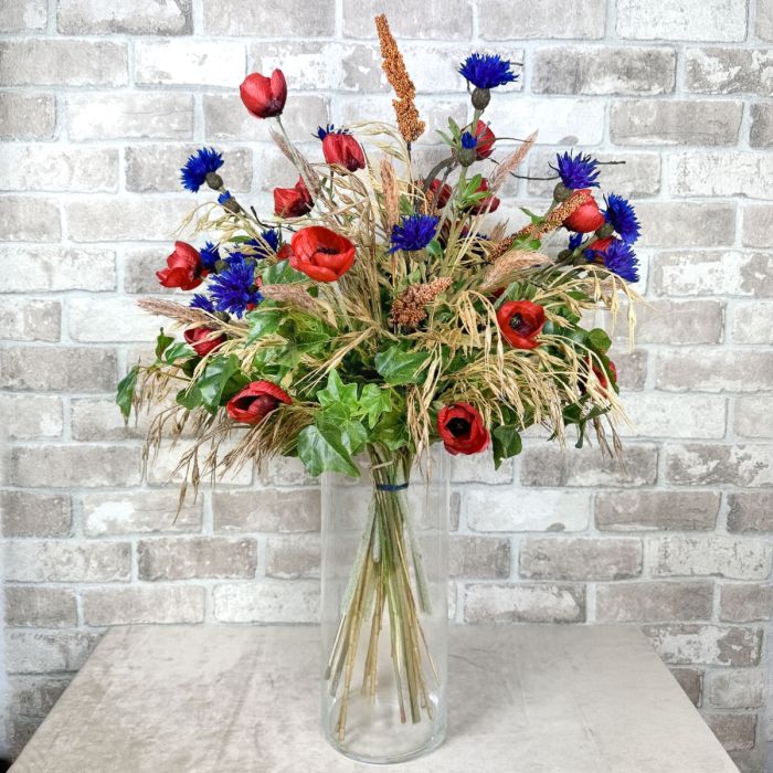 Field and meadow symphony! Matthias nous a demandé si nous pouvions créer deux bouquets de fleurs pour ses deux vases. Le style de ces fleurs devait correspondre à un arrangement de fleurs artificielles déjà existant, composé de fleurs des champs et fixé sur un panneau en bois. Le choix des fleurs a pu être fait rapidement grâce à cette consigne : outre les coquelicots et les bleuets, il y avait aussi du lierre, du saule tire-bouchon et bien sûr quelques épis de blé, d'avoine élevée et de sorgho. Les épis, avec leur couleur dorée et leurs courbes douces, confèrent au bouquet une atmosphère chaleureuse et champêtre. Ils symbolisent l'abondance et le temps des récoltes et ajoutent un naturel apaisant au bouquet. Les coquelicots et les bleuets les entourent habilement et apportent en outre de superbes touches de couleur. Les branches de saule tire-bouchon se faufilent à travers le bouquet et pointent audacieusement vers le haut. Enfin, les branches de lierre complètent parfaitement le bouquet et lui confèrent une plénitude naturelle. Vous aussi, vous aimeriez avoir la beauté des champs chez vous ? Shop the Look!