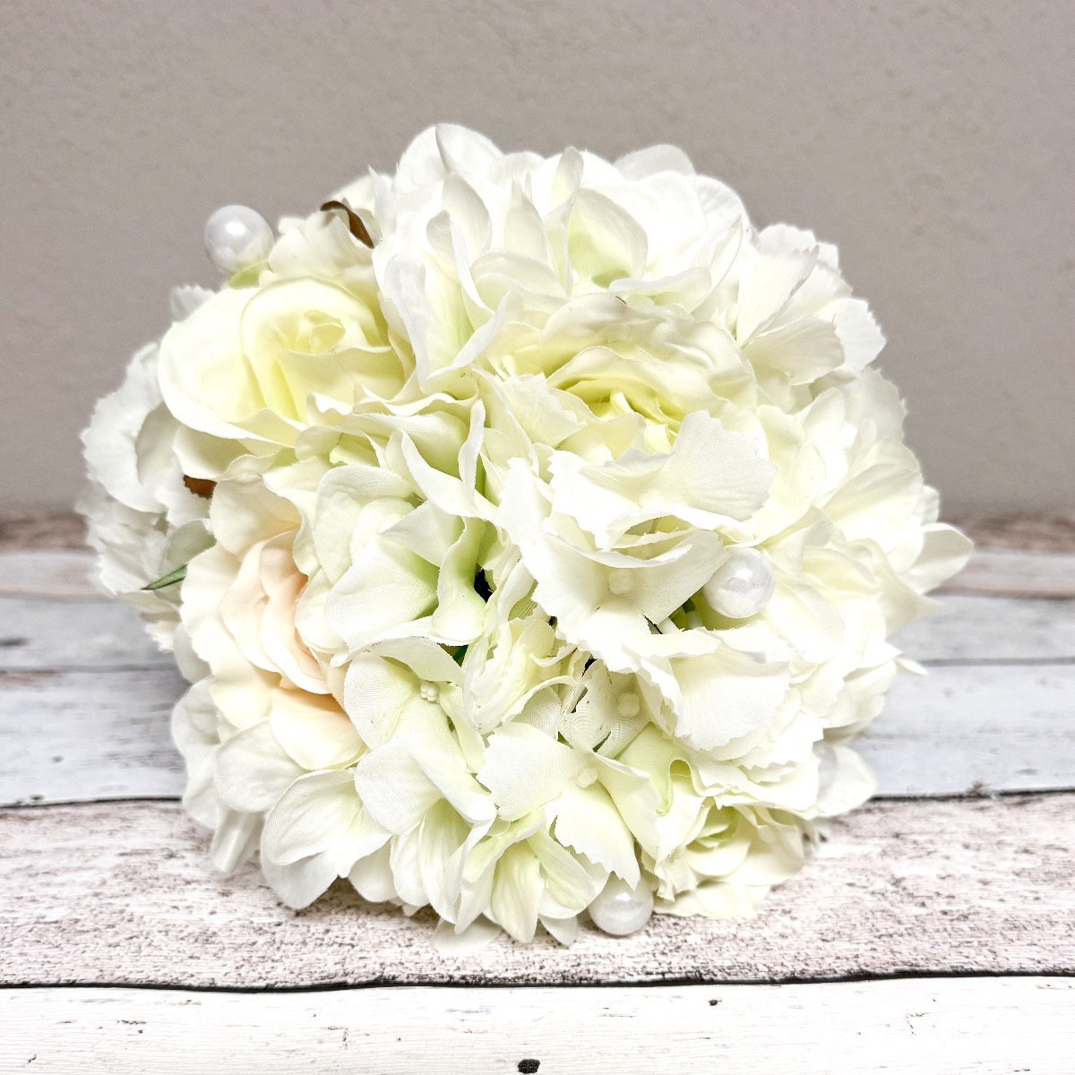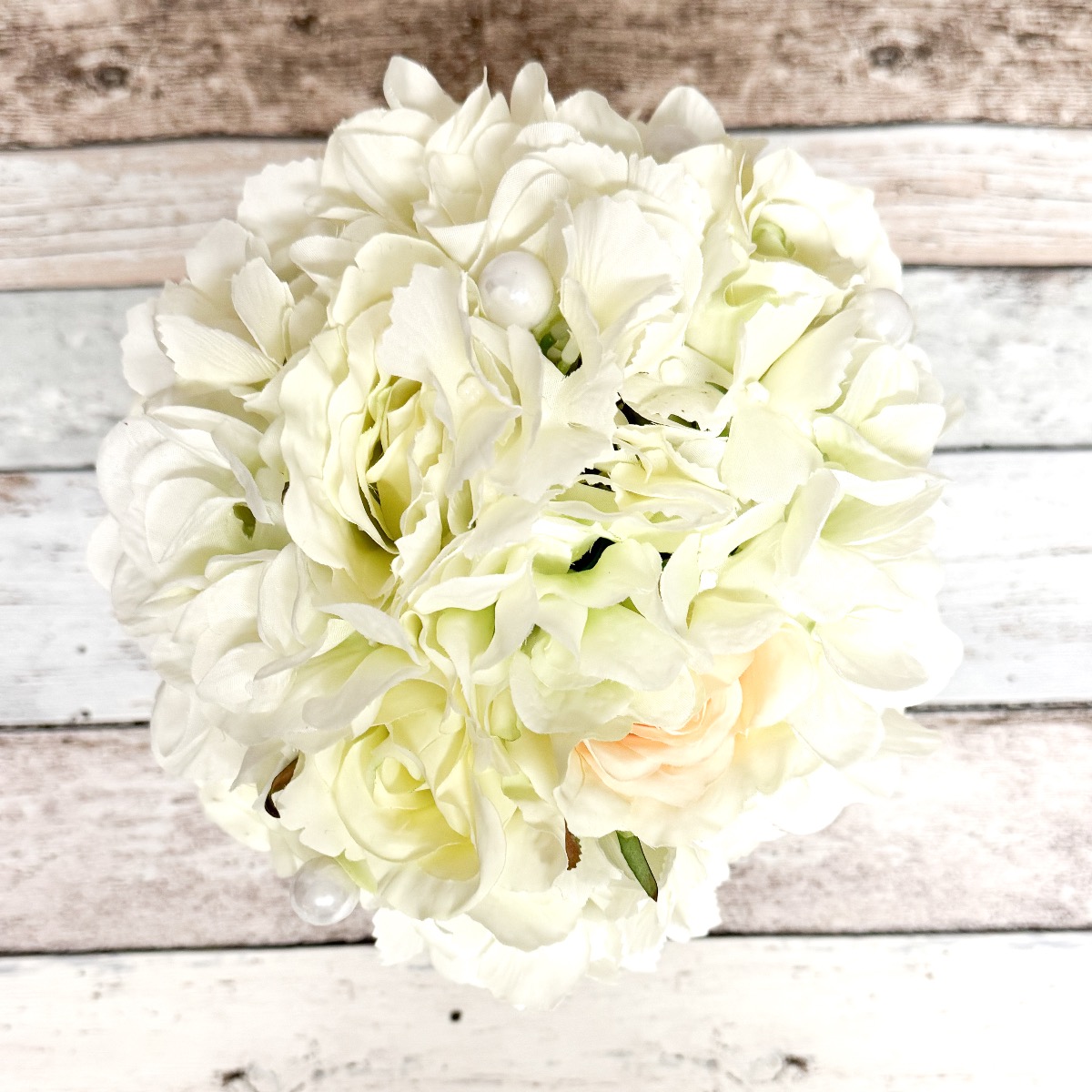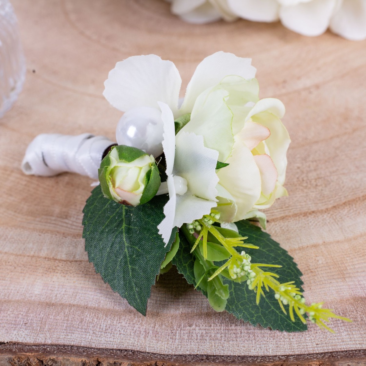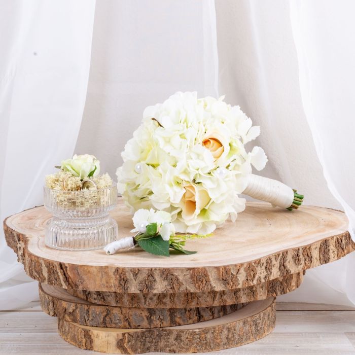 Glamorous passion! Les roses délicates et les hortensias de couleur crème se fondent harmonieusement les uns dans les autres et confèrent au bouquet une note romantique. Les perles intégrées au bouquet ajoutent une note subtile mais luxueuse. Elles brillent doucement à la lumière et ajoutent au bouquet une touche de glamour et de raffinement. Le marié porte une boutonnière assortie au bouquet de la mariée, composée d'une rose crème, de fines fleurs d'hortensia et d'une perle. Ces détails coordonnés unissent les mariés de manière subtile et complètent l'apparence élégante de la fête de mariage. Dans l'ensemble, ce bouquet de mariée dégage une aura de romantisme et d'élégance qui touche le cœur et enchante les yeux. Un compagnon vraiment enchanteur pour la mariée sur son chemin vers l'autel. Vous aussi, vous aimeriez un bouquet de mariage artificiel ? Shop the Look!