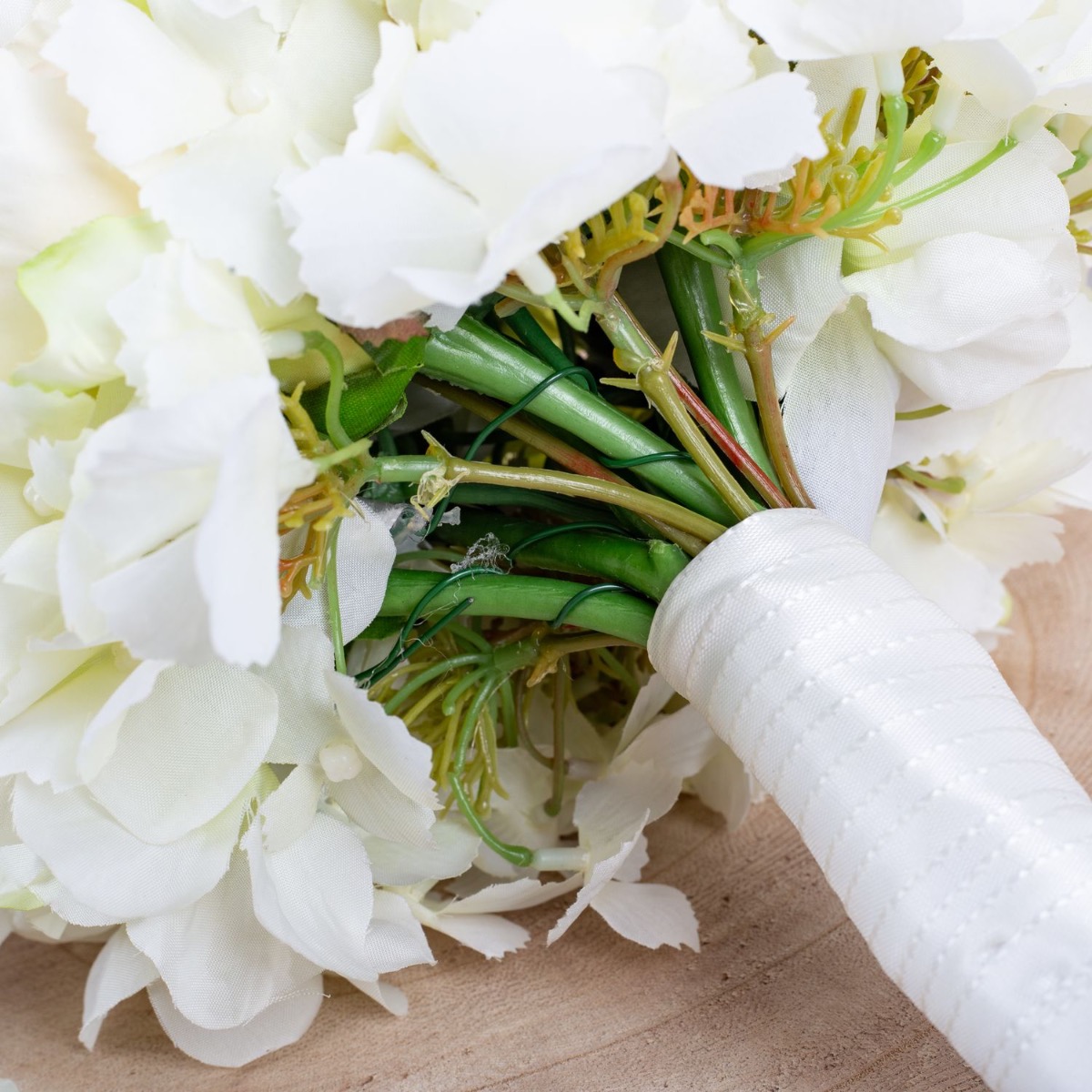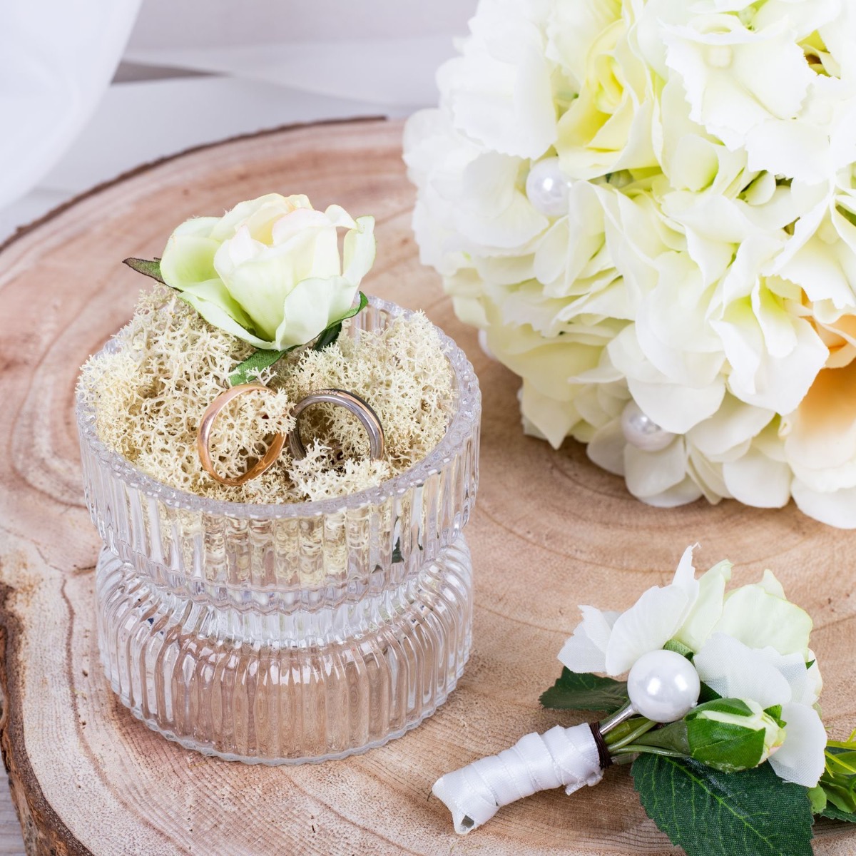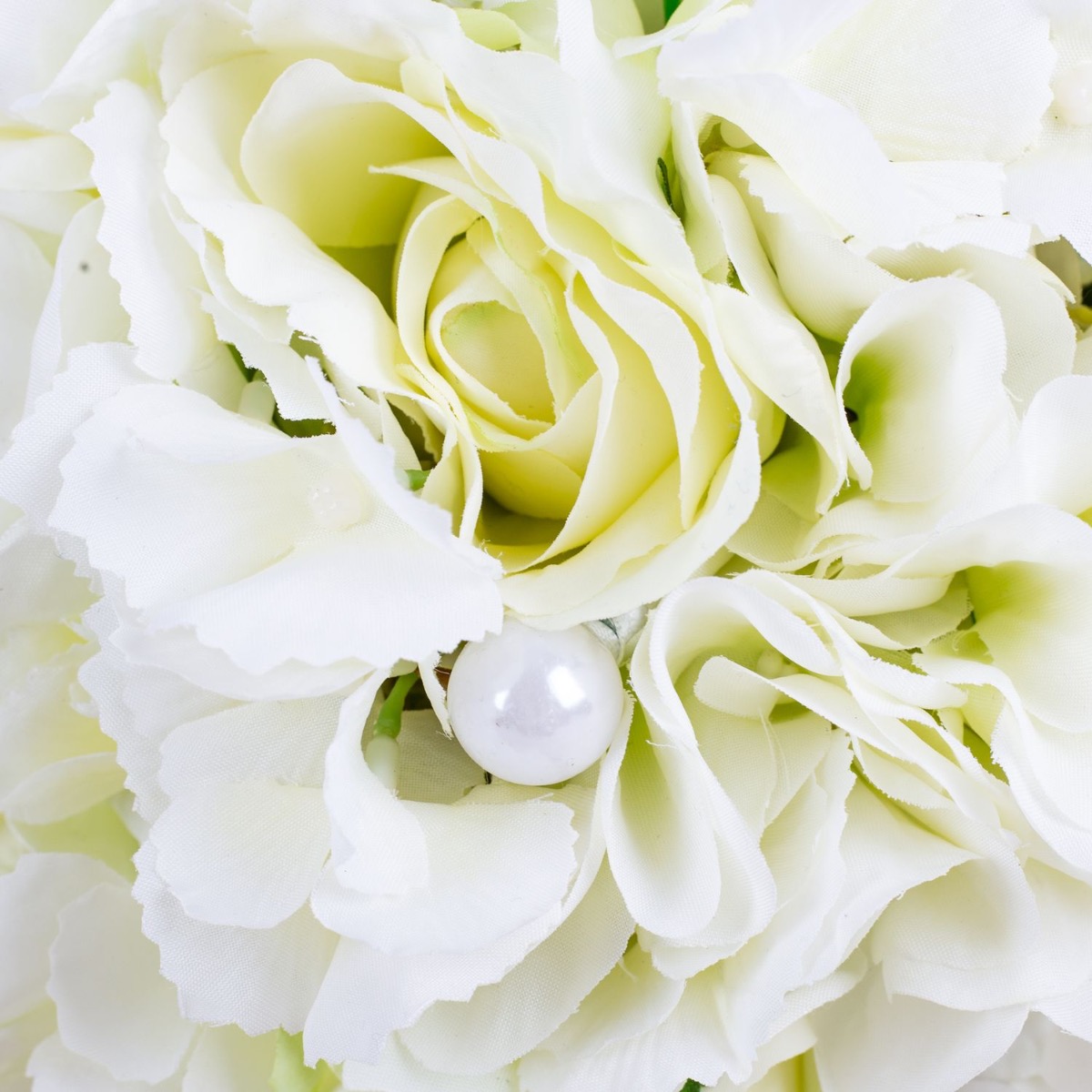 Glamorous passion! Les roses délicates et les hortensias de couleur crème se fondent harmonieusement les uns dans les autres et confèrent au bouquet une note romantique. Les perles intégrées au bouquet ajoutent une note subtile mais luxueuse. Elles brillent doucement à la lumière et ajoutent au bouquet une touche de glamour et de raffinement. Le marié porte une boutonnière assortie au bouquet de la mariée, composée d'une rose crème, de fines fleurs d'hortensia et d'une perle. Ces détails coordonnés unissent les mariés de manière subtile et complètent l'apparence élégante de la fête de mariage. Dans l'ensemble, ce bouquet de mariée dégage une aura de romantisme et d'élégance qui touche le cœur et enchante les yeux. Un compagnon vraiment enchanteur pour la mariée sur son chemin vers l'autel. Vous aussi, vous aimeriez un bouquet de mariage artificiel ? Shop the Look!