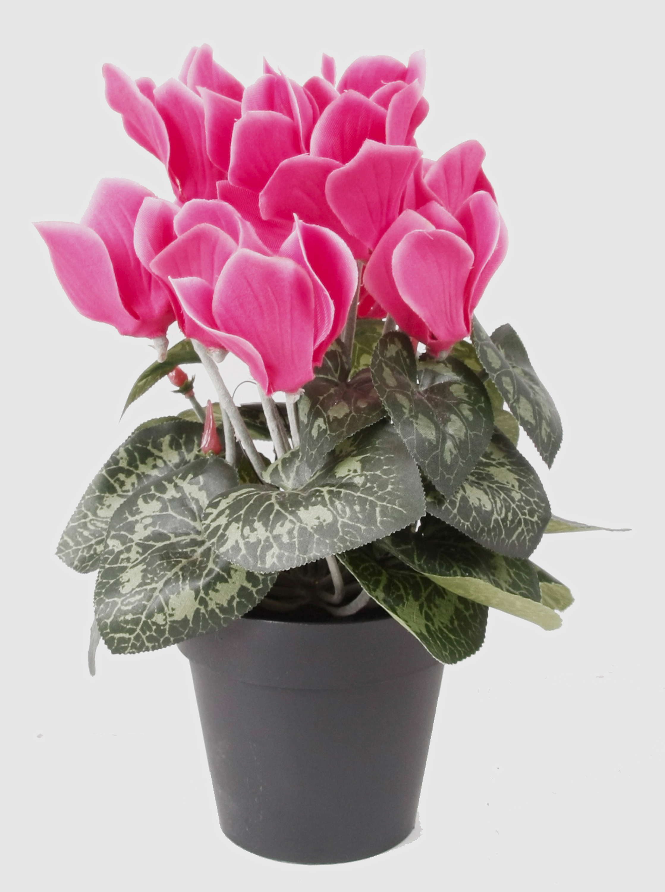Jolie petite plante fleurie pourvue de 12 fleurs rose fuchsia et 4 boutons. Ce cyclamen synthétique est livré en pot et mesure au total environ 25 cm de haut.