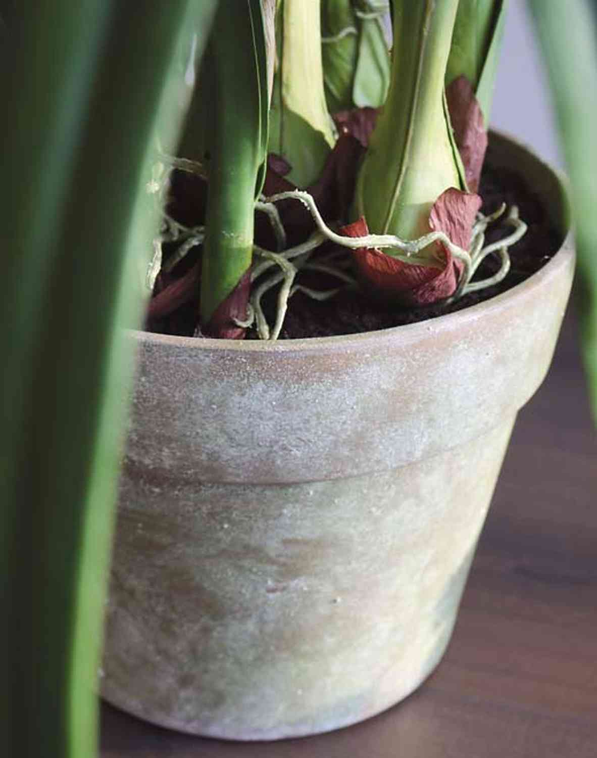 - Racines aériennes, terre décorative noire et longues feuilles vert foncé, le tout solidement fixé ensemble