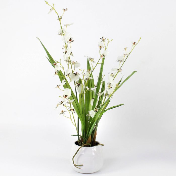 Petite orchidée Oncidium constituée de 2 tiges et pourvue de fleurs de couleur blanc-marron. Cette élégante fleur artificielle est livrée dans son pot en céramique et mesure au total environ 50 cm de haut.