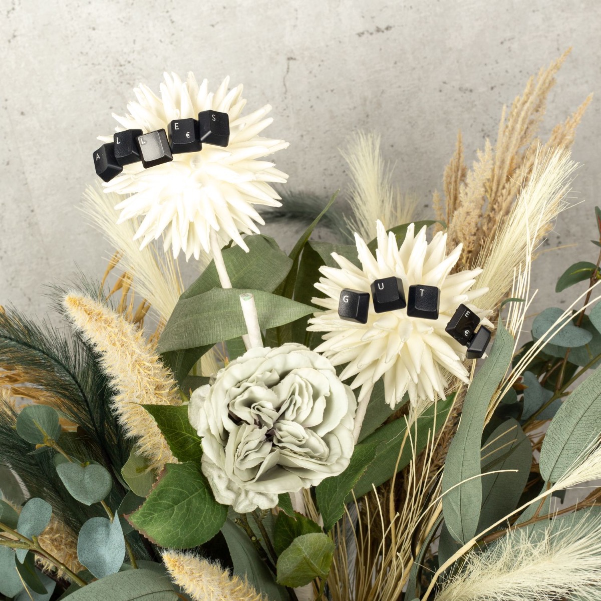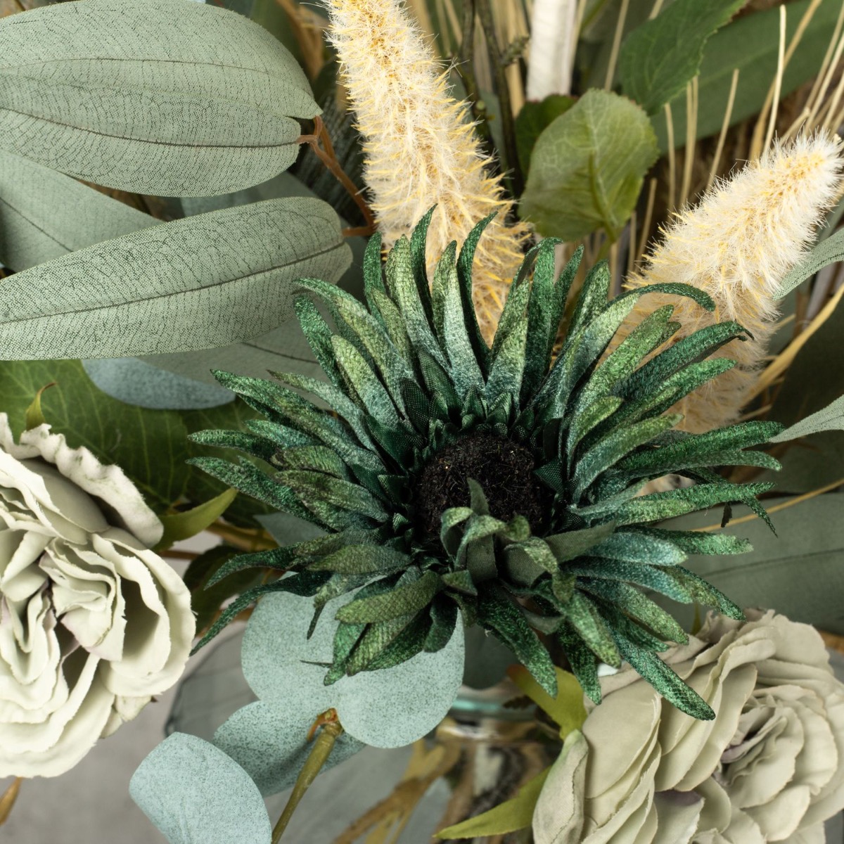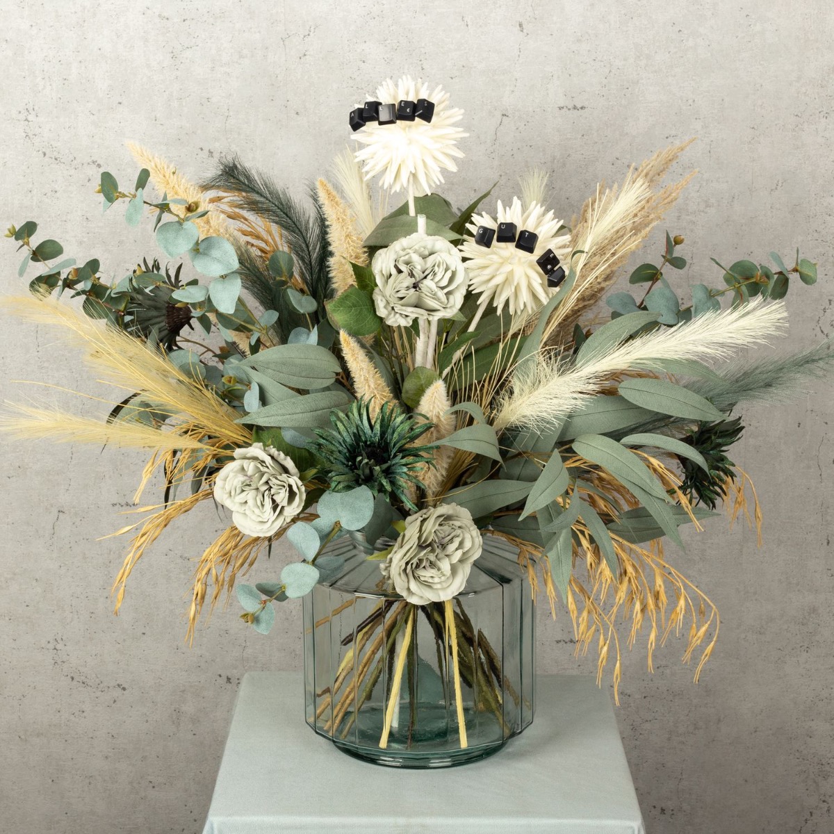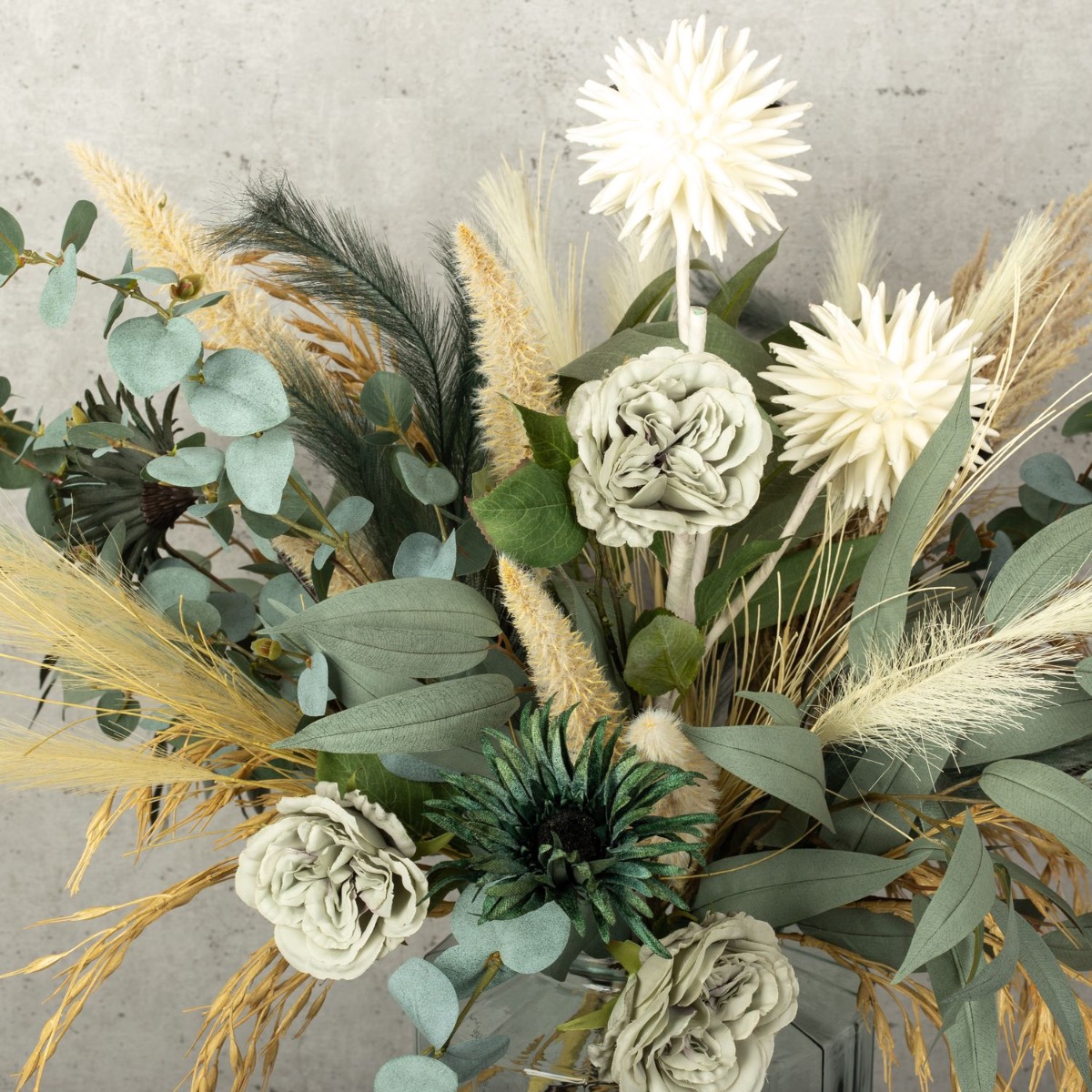 Vert eucalyptus et beige céréale ! Nous avons réalisé ce bouquet de fleurs moderne pour dire au revoir à une collaboratrice très spéciale. Notre Stéphanie a malheureusement décidé de quitter l'entreprise. Une raison pour nous de créer un bouquet de fleurs exceptionnel. Des roses d'un vert tendre et des gerberas d'un bleu pétrole velouté rendent ce bouquet tout simplement unique. Le stipa dans différentes nuances de beige et de vert a un effet rafraîchissant et donne au bouquet un aspect naturel. Les branches d'eucalyptus sont tout simplement parfaites et invitent à reproduire ce bouquet. L'ail ornemental blanc, le point focal de ce look, brille et fait rayonner l'ensemble du bouquet. Vous aussi, faites plaisir à quelqu'un de spécial en lui offrant ce cadeau.Shop the look!