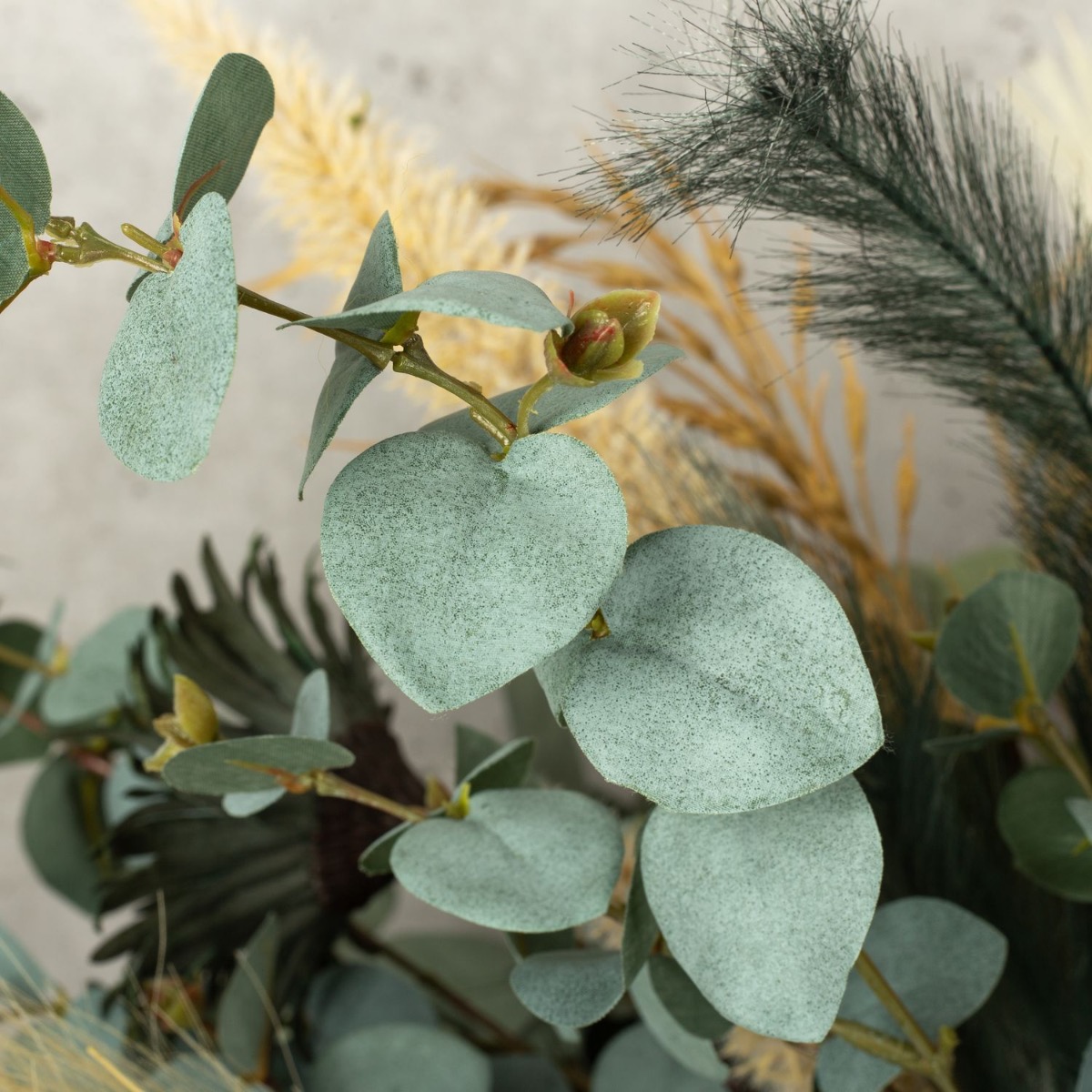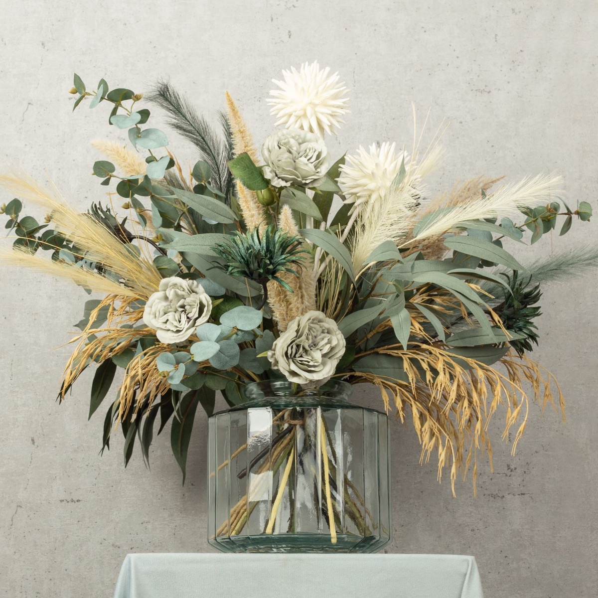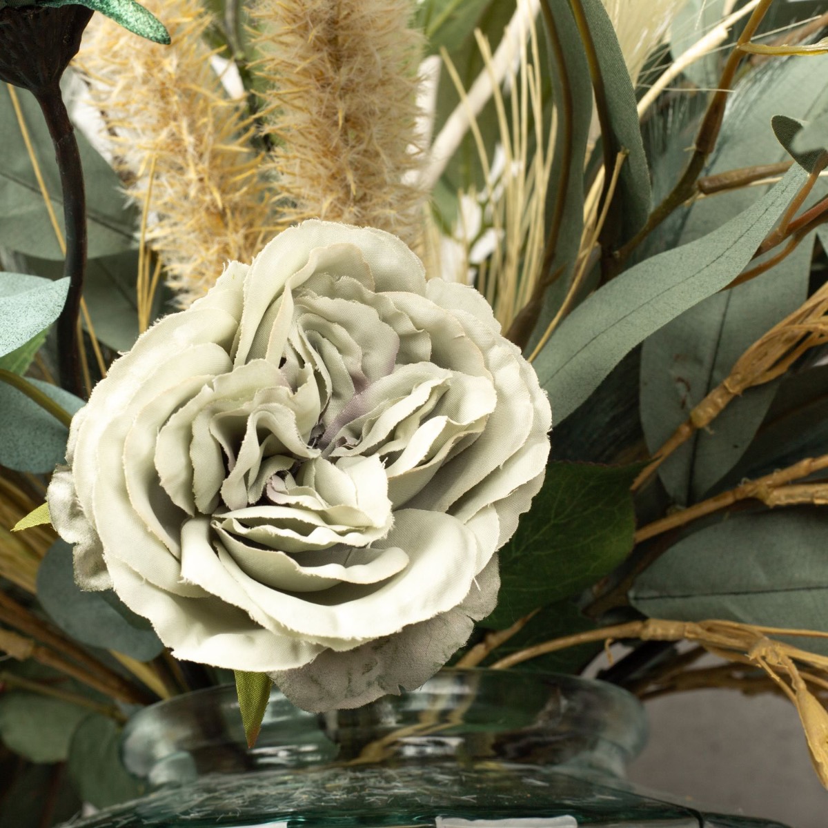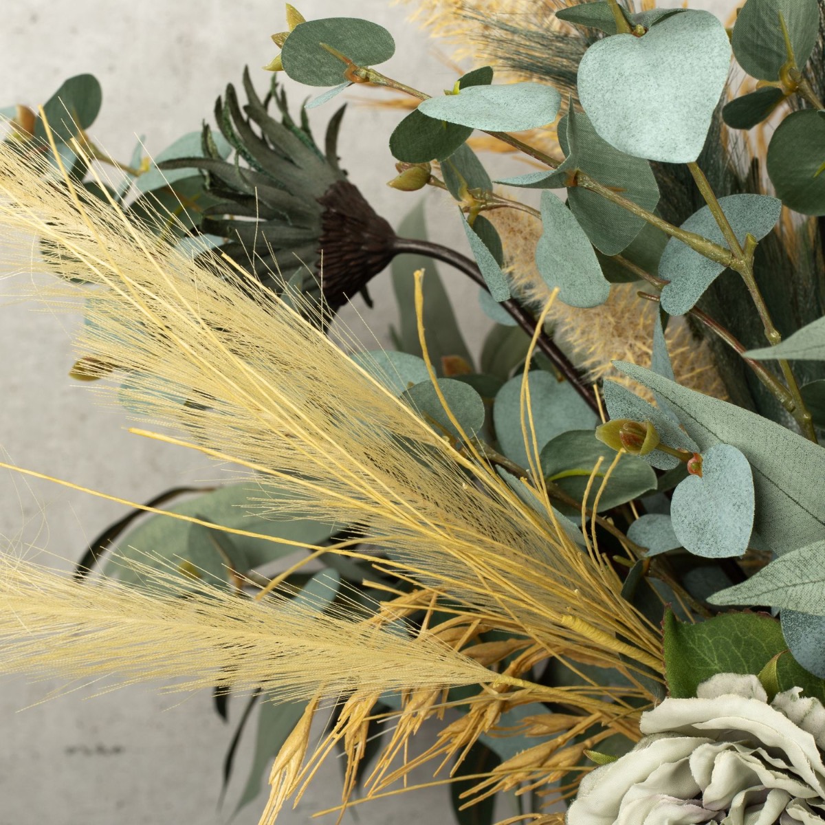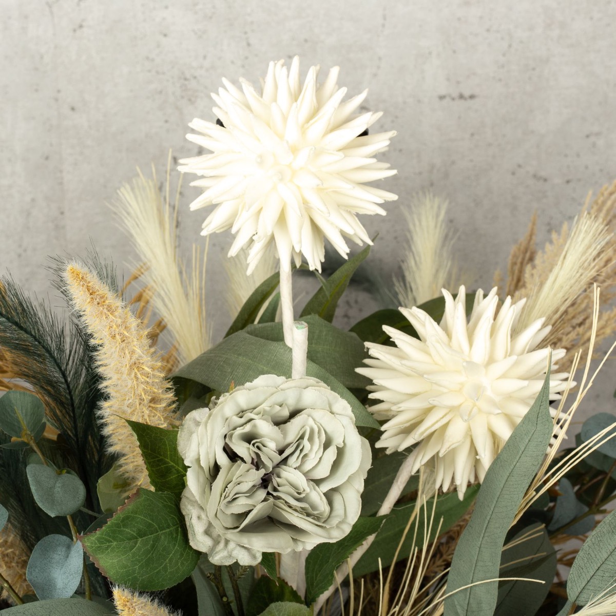 Vert eucalyptus et beige céréale ! Nous avons réalisé ce bouquet de fleurs moderne pour dire au revoir à une collaboratrice très spéciale. Notre Stéphanie a malheureusement décidé de quitter l'entreprise. Une raison pour nous de créer un bouquet de fleurs exceptionnel. Des roses d'un vert tendre et des gerberas d'un bleu pétrole velouté rendent ce bouquet tout simplement unique. Le stipa dans différentes nuances de beige et de vert a un effet rafraîchissant et donne au bouquet un aspect naturel. Les branches d'eucalyptus sont tout simplement parfaites et invitent à reproduire ce bouquet. L'ail ornemental blanc, le point focal de ce look, brille et fait rayonner l'ensemble du bouquet. Vous aussi, faites plaisir à quelqu'un de spécial en lui offrant ce cadeau.Shop the look!