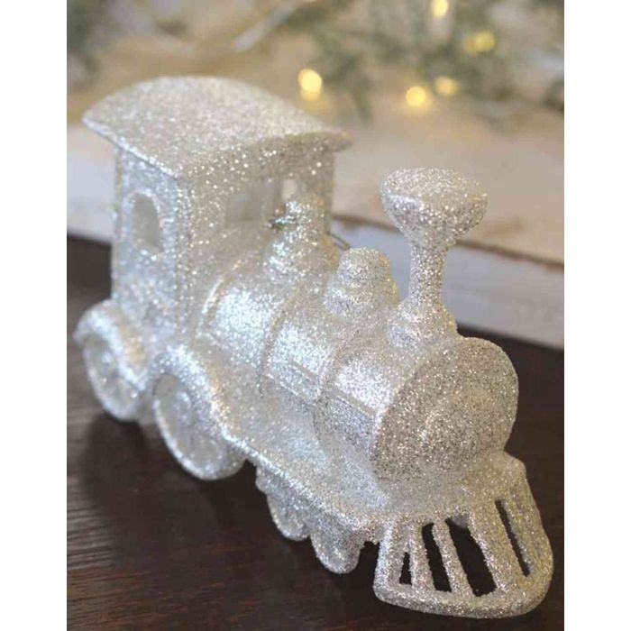 Décoration de Noël Locomotive GEREON, acrylique, pendentif, paillettes, blanc-argent, 12x7cm
