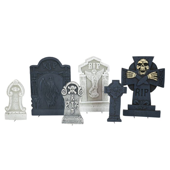 Décoration Halloween Pierres tombales LUCRETIA, 6 pièces, aspect pierre, polystyrène, tête de mort, gris-noir