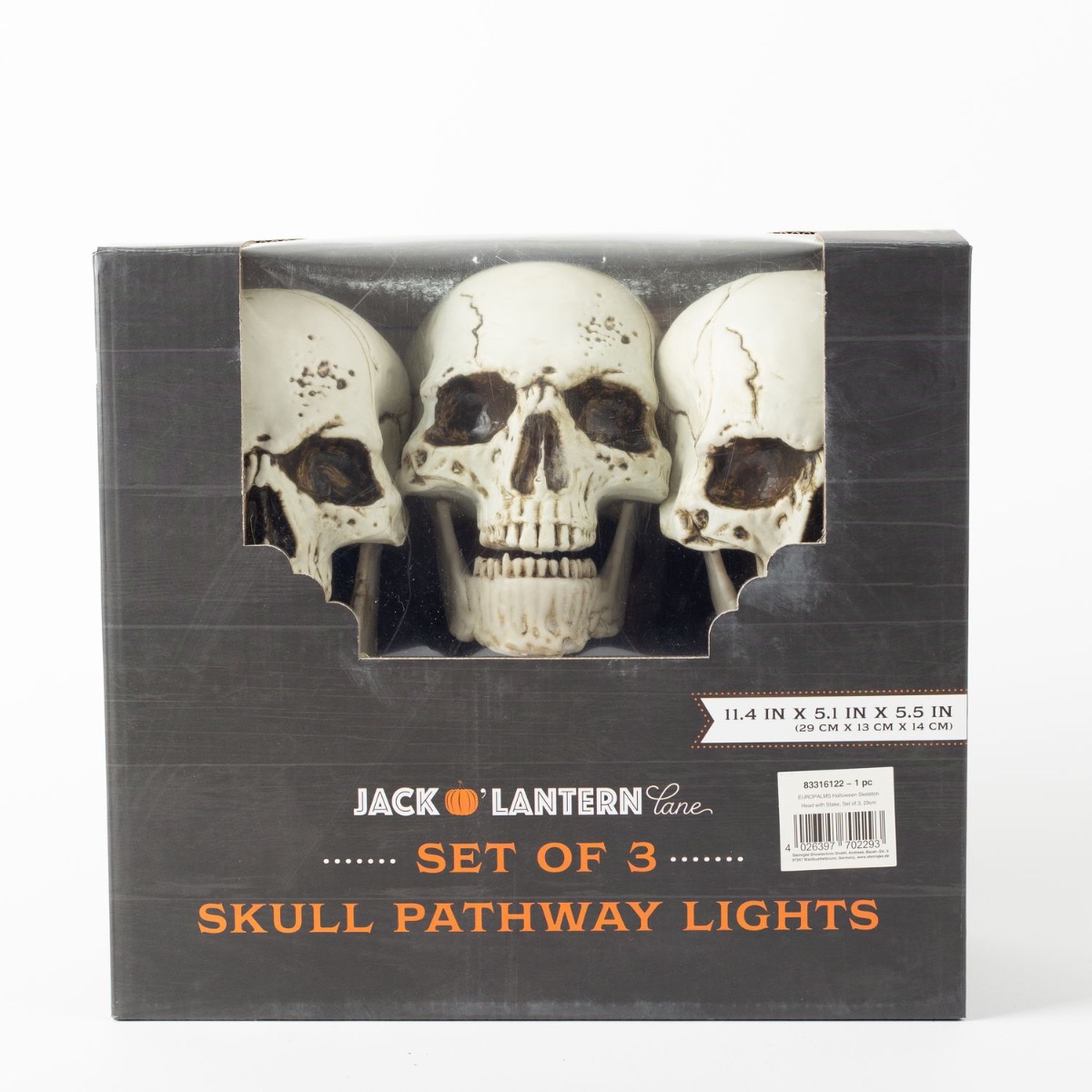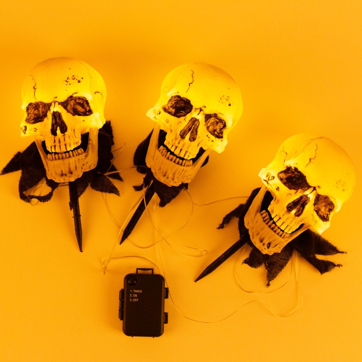 Décoration Halloween Tête de mort JERVIS sur piquet à planter, LEDs, 3 pièces, 30cm