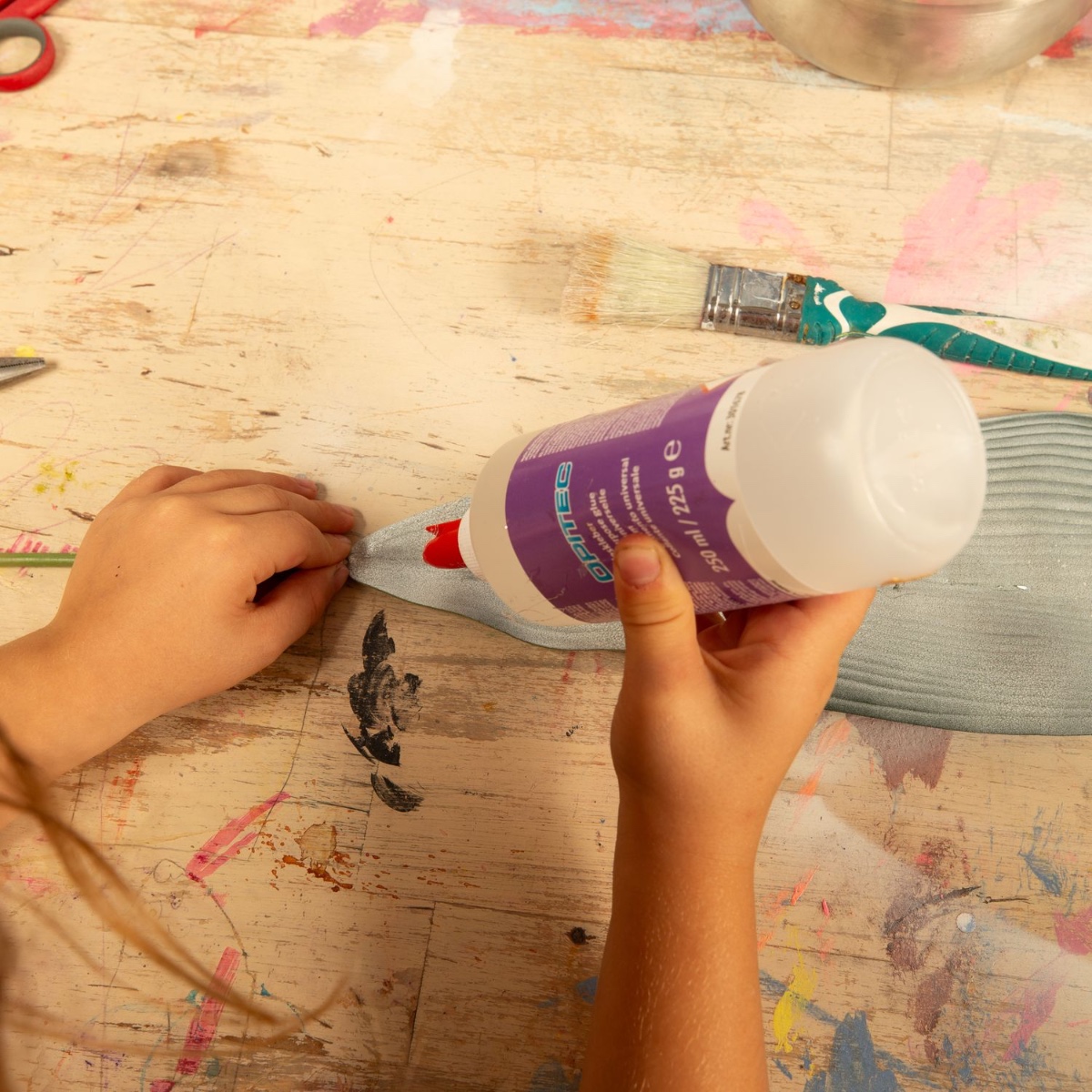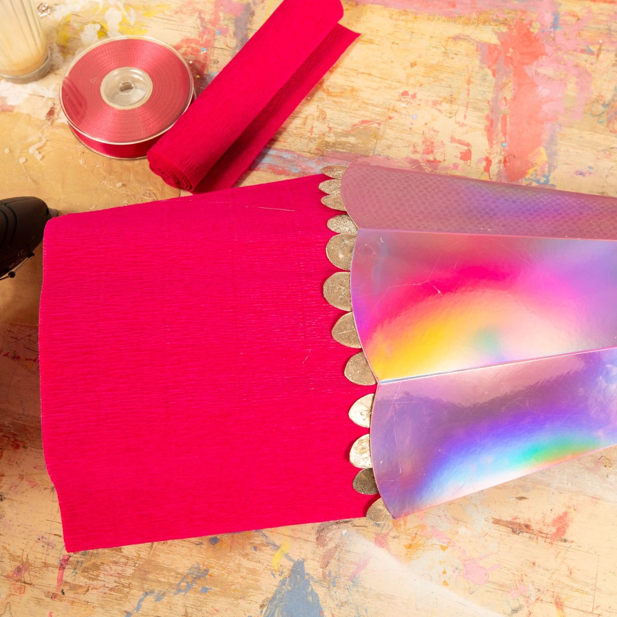 Matériel supplémentaire nécessaire : une pochette surprise vierge, de la colle liquide, du papier crépon, des paillettes et un pinceau