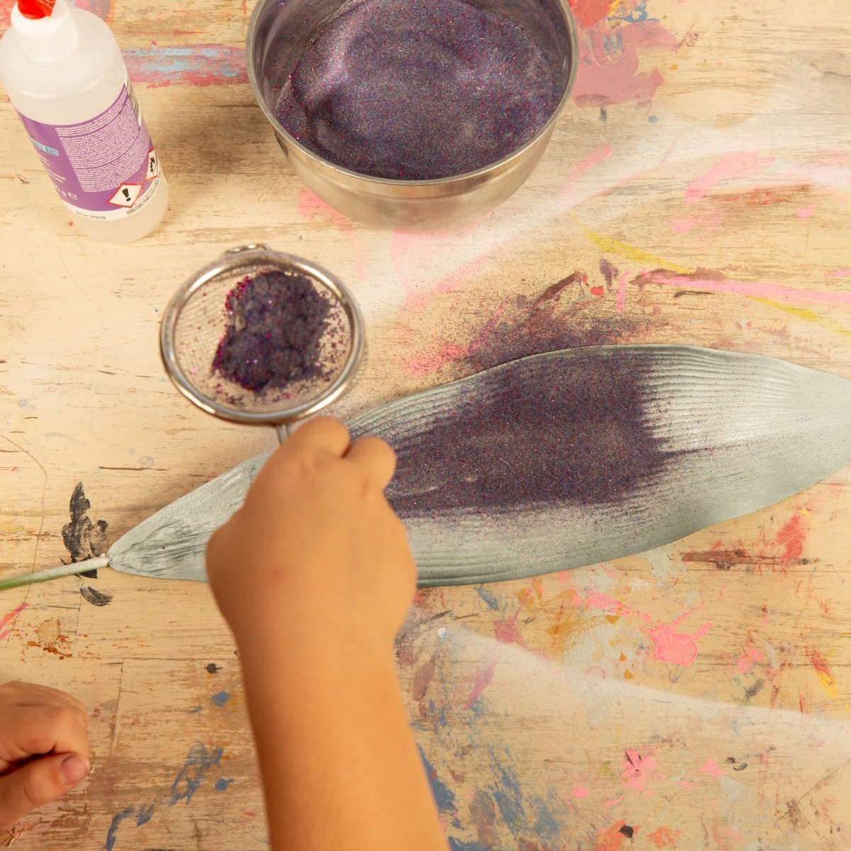 2. Appliquez de la colle liquide transparente à l'aide d'un pinceau sur les grandes feuilles séchées et saupoudrez-les de paillettes. Faites de même au verso.