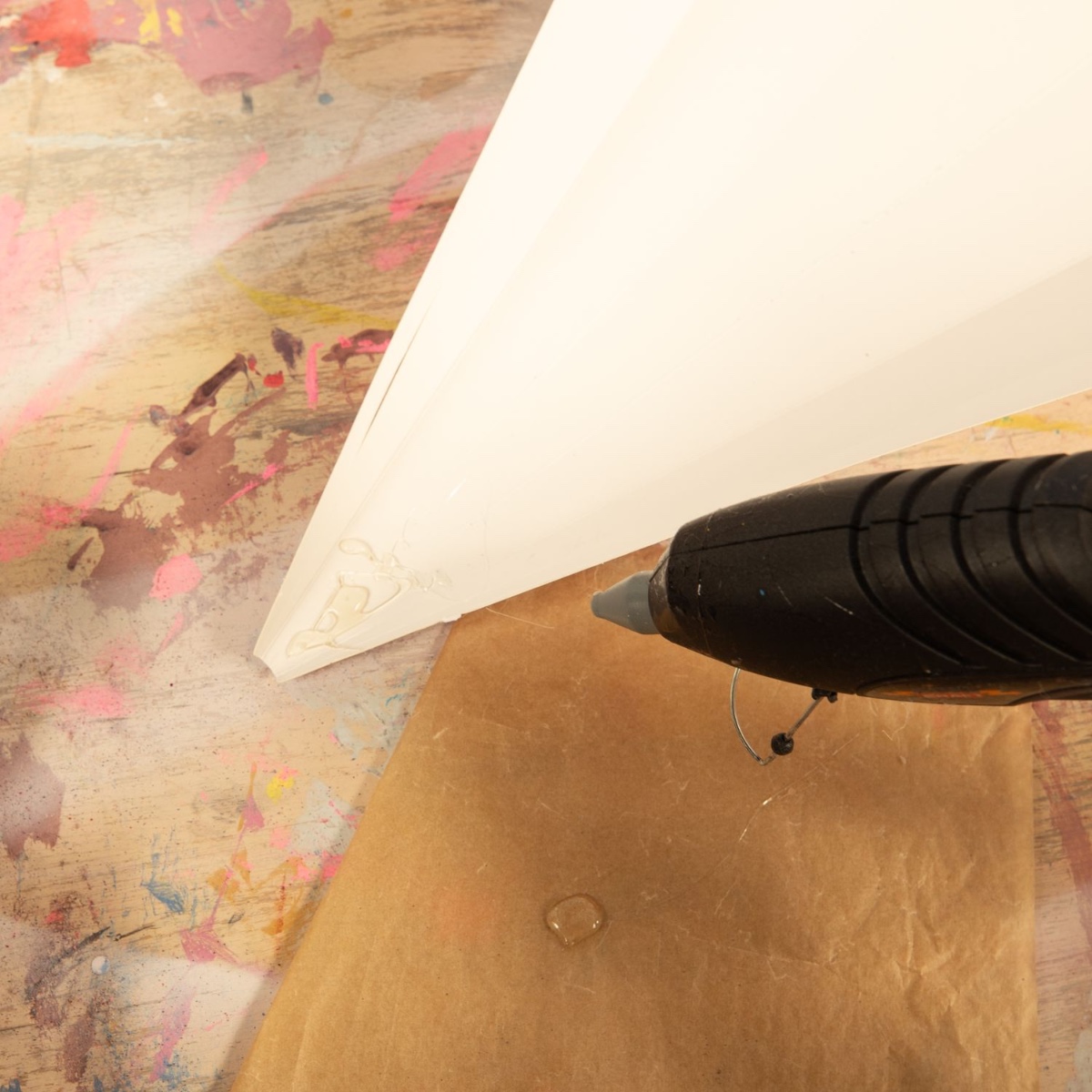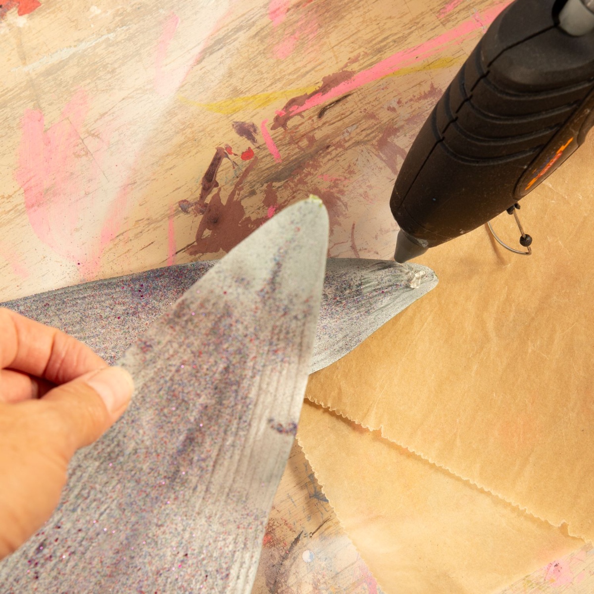 3. Collez les deux feuilles ensemble à l'aide du pistolet à colle chaude de manière à former une nageoire. Collez ensuite la nageoire à l'extrémité de la pochette surprise.