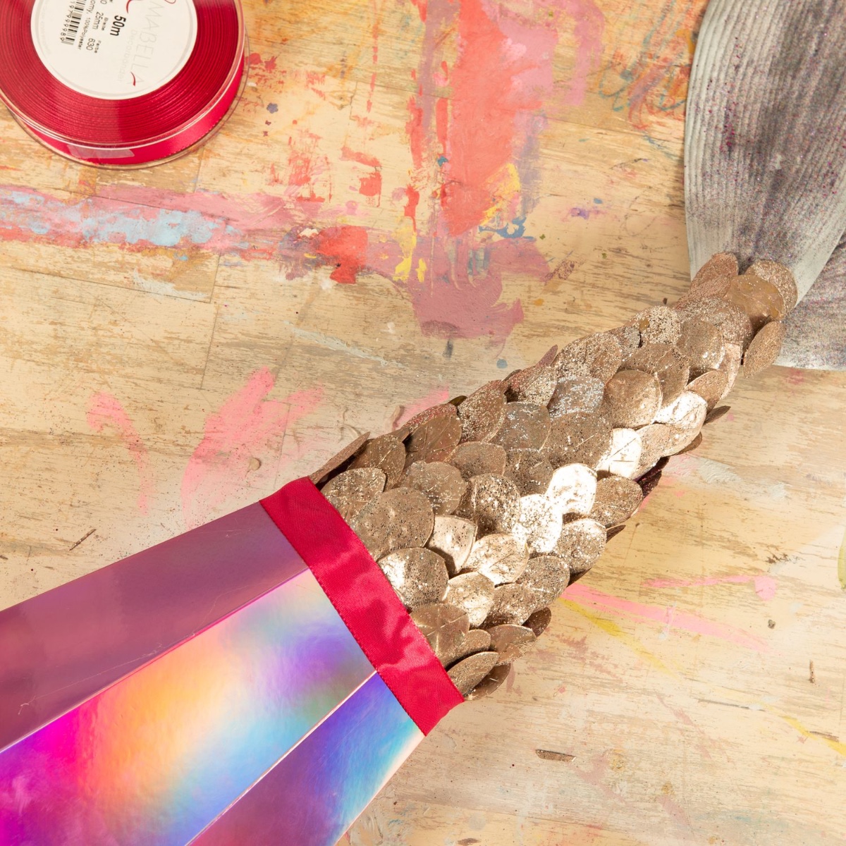 6. Pour finir, nous avons fixé un ruban de satin à l'aide de colle chaude sur le bord supérieur des écailles de poisson.