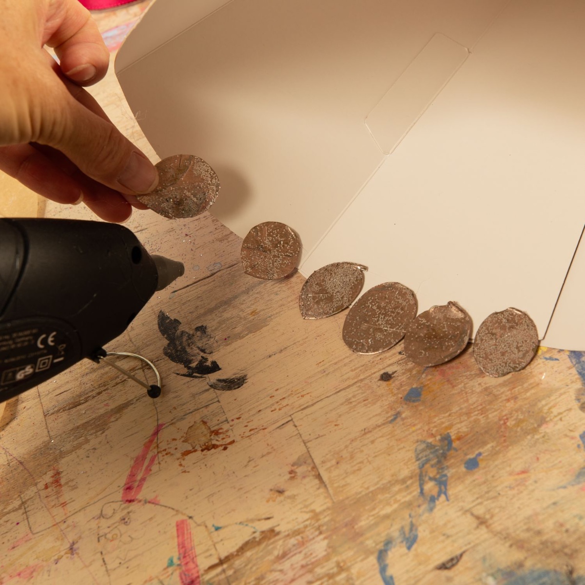 5. Collez les petites feuilles représentant les écailles du poisson sur la nageoire caudale à l'aide d'un pistolet à colle. Commencez par le bas et remontez progressivement en décalant les feuilles. Il est préférable de coller les premières écailles à la base de la nageoire. Cela permet d'obtenir une belle transition. Afin que l'écolier puisse bien tenir le cornet, nous avons fixé les écailles uniquement dans la partie inférieure du cornet et avons laissé la partie centrale libre.